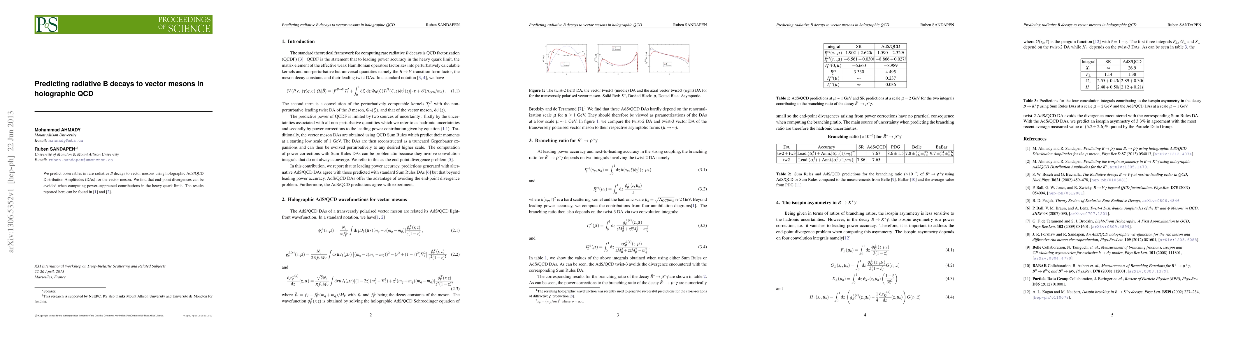 This paper predicts observables for radiative B decays to vector mesons using holographic AdS/QCD Distribution Amplitudes, demonstrating that end-point divergences can be avoided in the heavy quark limit. The findings are detailed in references [1] and [2].