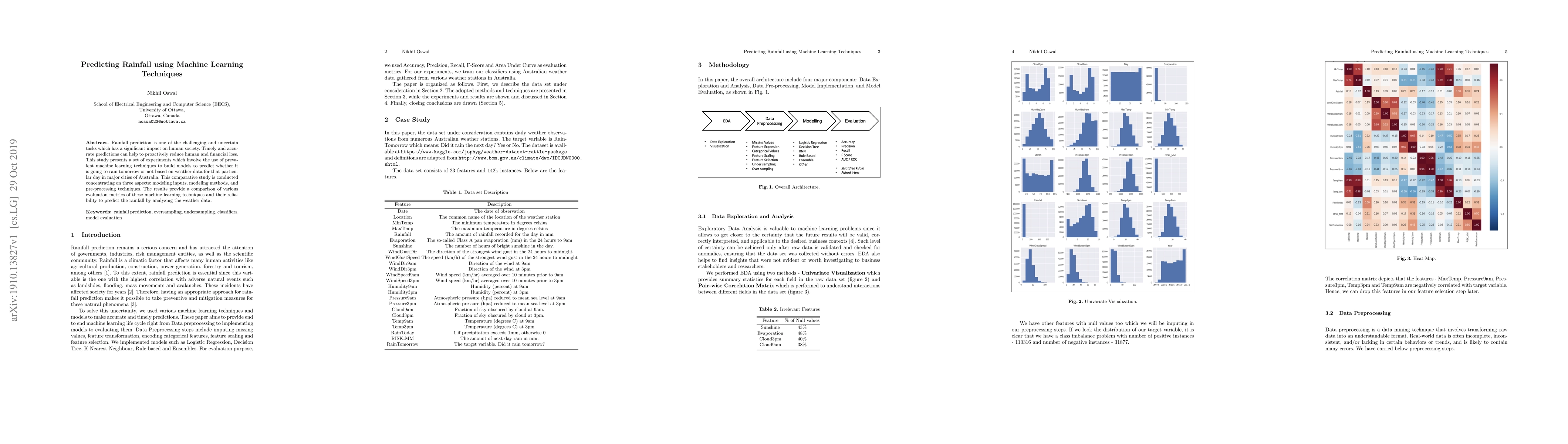 This study employs machine learning techniques to predict daily rainfall in major Australian cities, comparing modeling inputs, methods, and pre-processing techniques. The results highlight the effectiveness of various machine learning models in forecasting rainfall based on weather data.