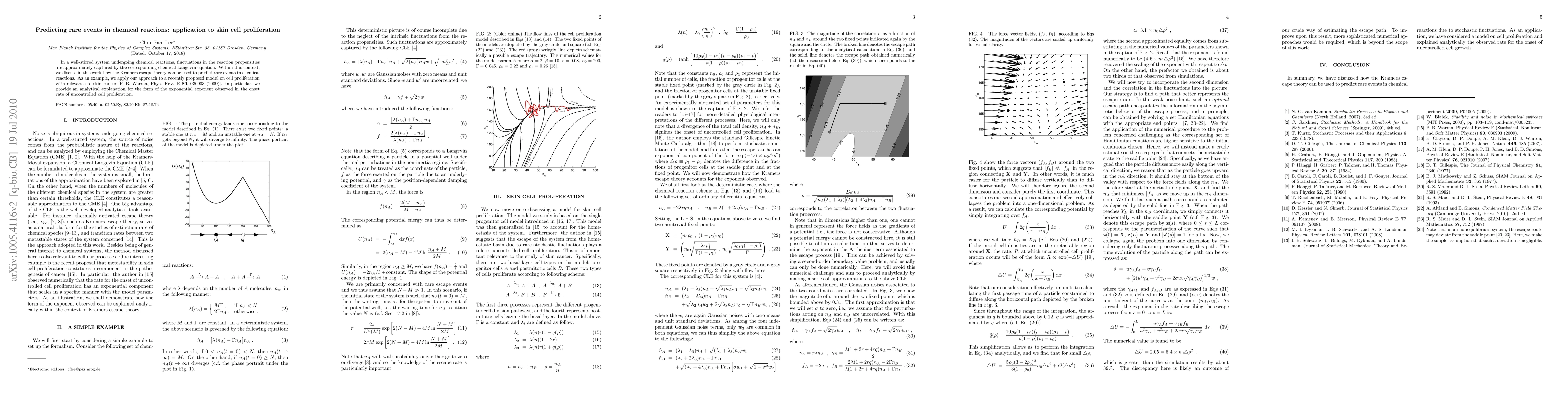 This paper applies Kramers escape theory to predict rare events in chemical reactions, using the chemical Langevin equation to model fluctuations. It specifically analyzes a model of skin cell proliferation, providing an analytical explanation for the exponential growth rate observed in uncontrolled cell proliferation.