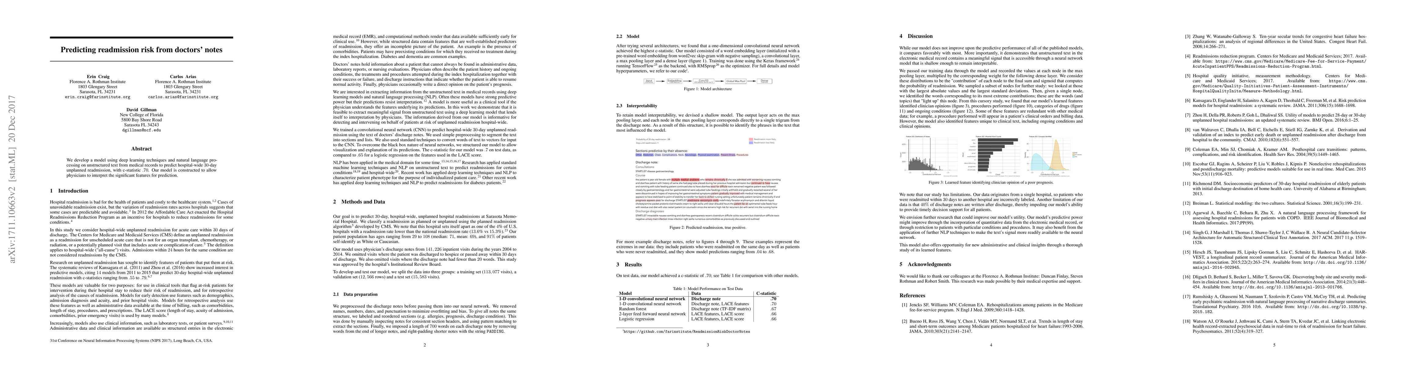 We develop a model using deep learning techniques and natural language processing on unstructured text from medical records to predict hospital-wide $30$-day unplanned readmission, with c-statistic $.70$. Our model is constructed to allow physicians to interpret the significant features for prediction.