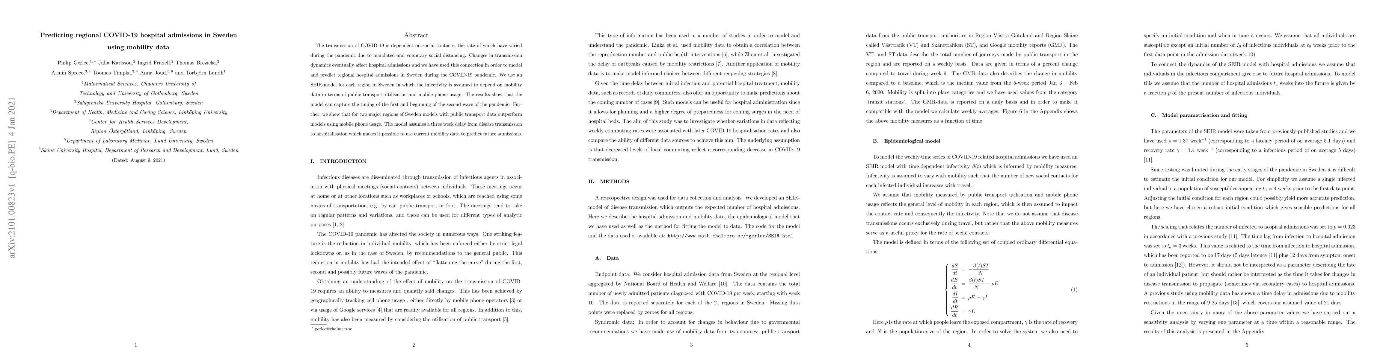 This paper models regional COVID-19 hospital admissions in Sweden using an SEIR-model linked to mobility data, including public transport and mobile phone usage. The study finds that models incorporating public transport data are more accurate for predicting hospital admissions, particularly in major regions.