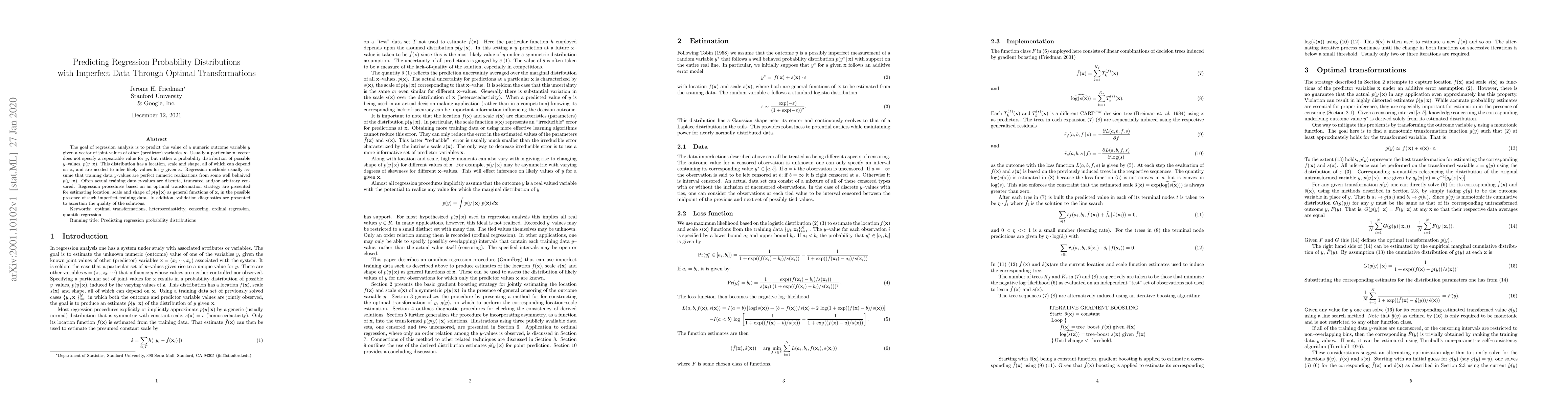 This paper proposes regression methods for estimating the probability distribution of a numeric outcome given predictor variables, even when training data is imperfect. It introduces optimal transformation strategies to estimate the distribution's location, scale, and shape, and provides validation diagnostics for assessing the quality of the solutions.