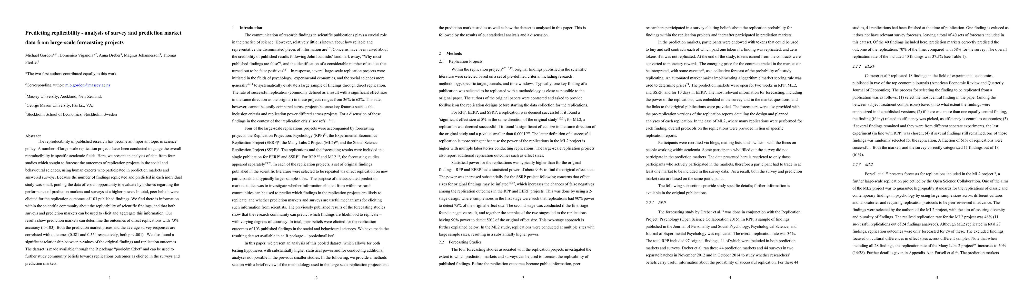 This study analyzes data from four large-scale forecasting projects to assess the replicability of scientific findings in social and behavioral sciences. It finds that both prediction markets and surveys can effectively aggregate expert opinions on replication outcomes, with prediction markets achieving 73% accuracy. The results suggest that scientific community beliefs correlate with actual replication success.