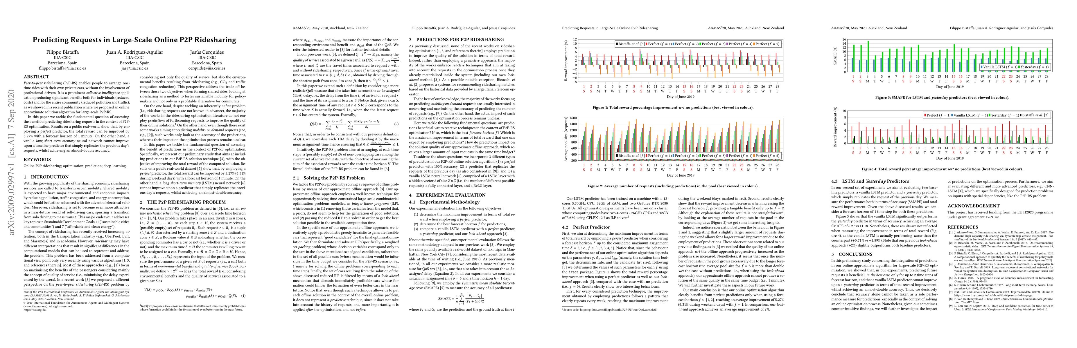 This paper investigates the benefits of predicting ridesharing requests in large-scale peer-to-peer ridesharing systems. Results show that a perfect predictor can improve total rewards by 5.27% within a 1-minute forecast horizon, while a LSTM neural network fails to outperform a simple baseline predictor.