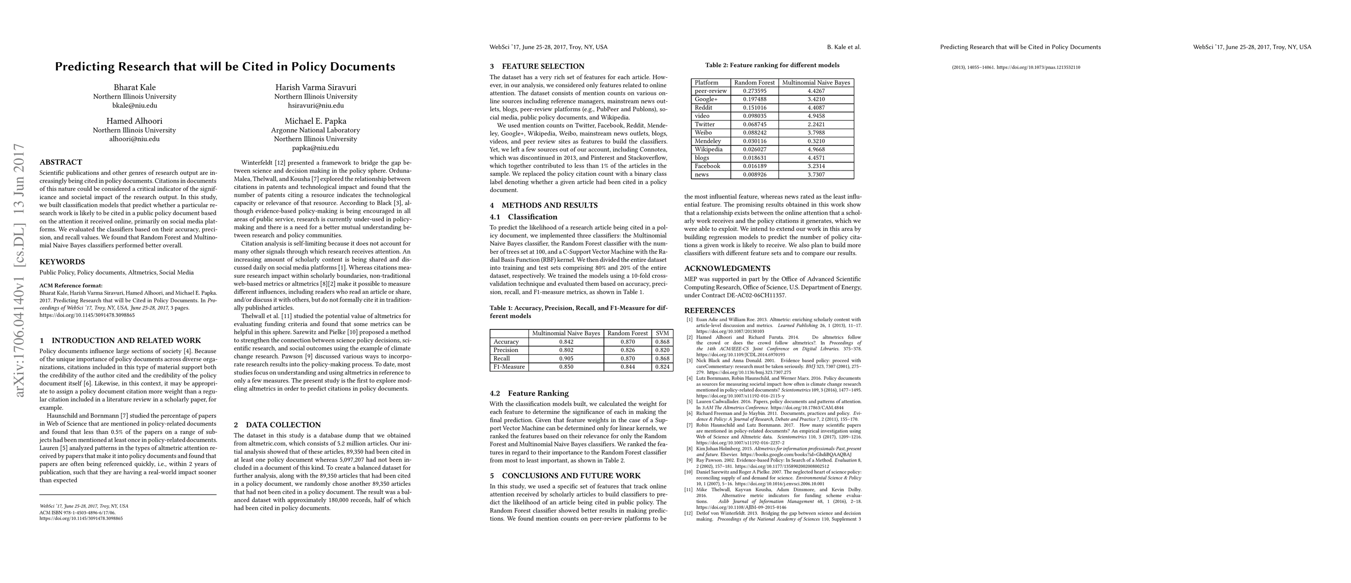 This study predicts which research papers are likely to be cited in policy documents based on their online attention, using Random Forest and Multinomial Naive Bayes classifiers with high accuracy and precision.