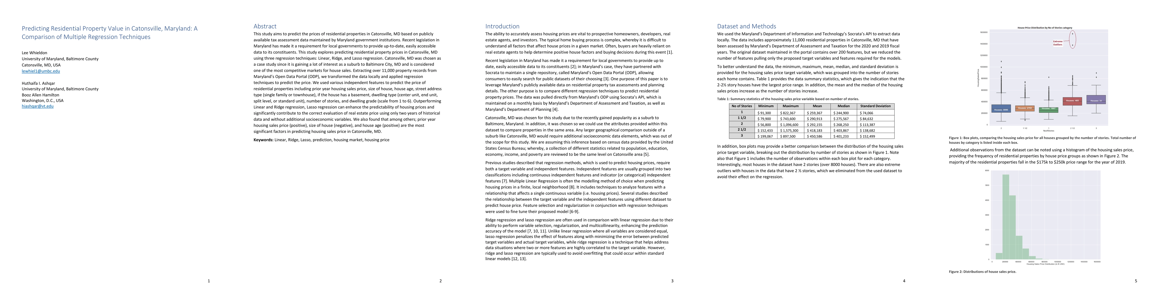 This study compares multiple regression techniques to predict residential property values in Catonsville, Maryland, finding that a specific model yields the most accurate results. The findings have implications for real estate developers and investors seeking to optimize their investment decisions.