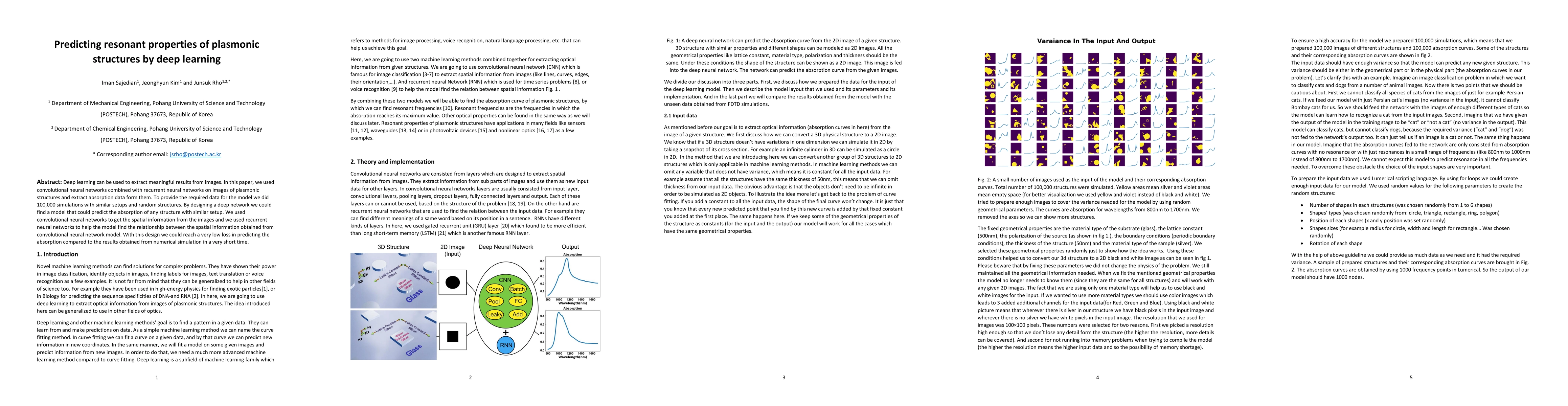 Deep learning can be used to extract meaningful results from images. In this paper, we used convolutional neural networks combined with recurrent neural networks on images of plasmonic structures and extract absorption data form them. To provide the required data for the model we did 100,000 simulations with similar setups and random structures. By designing a deep network we could find a model that could predict the absorption of any structure with similar setup. We used convolutional neural networks to get the spatial information from the images and we used recurrent neural networks to help the model find the relationship between the spatial information obtained from convolutional neural network model. With this design we could reach a very low loss in predicting the absorption compared to the results obtained from numerical simulation in a very short time.