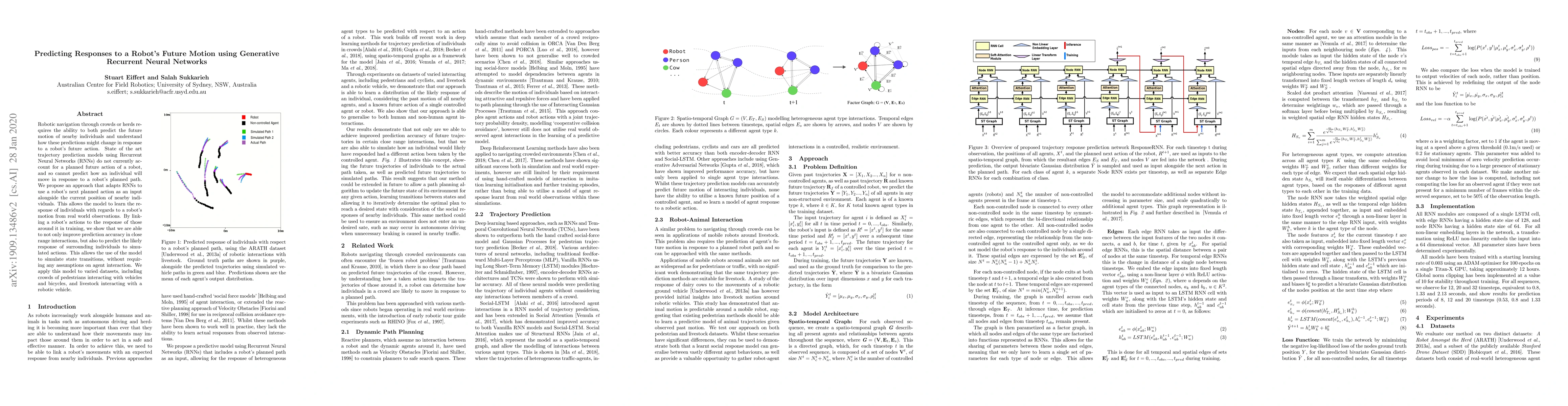 This paper proposes a method to predict human responses to a robot's future motion using generative Recurrent Neural Networks (RNNs) that incorporate the robot's planned actions. The model improves prediction accuracy by simulating interactions without assumptions on agent behavior, tested on pedestrian and livestock datasets.
