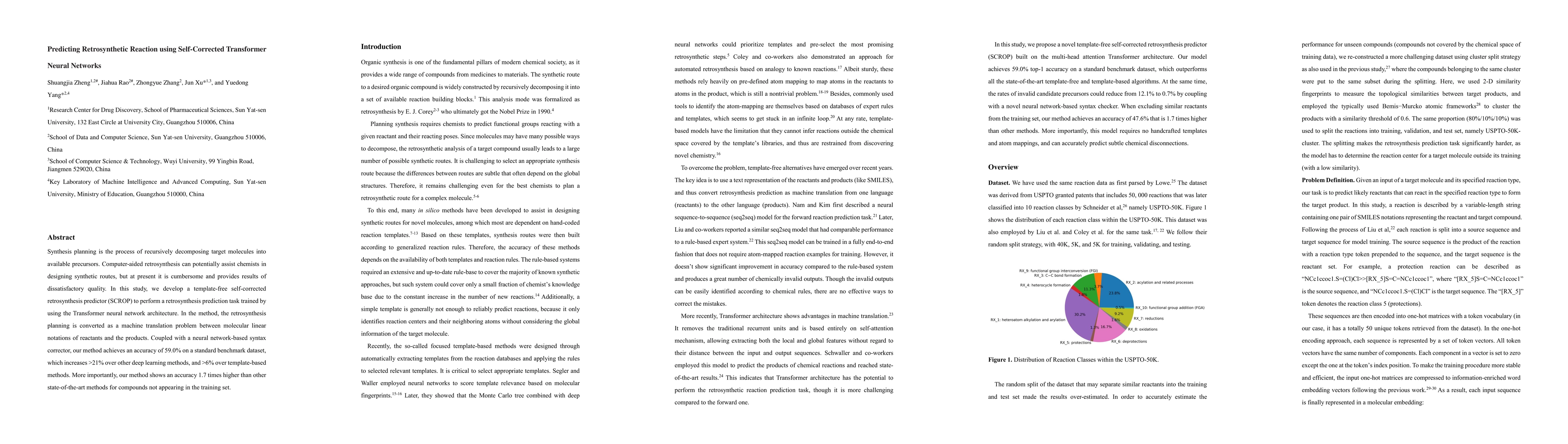 This paper introduces a self-corrected Transformer neural network for predicting retrosynthetic reactions, transforming the task into a machine translation problem. The proposed method achieves a 59.0% accuracy on a benchmark dataset, outperforming other deep learning and template-based methods, especially for unseen compounds.