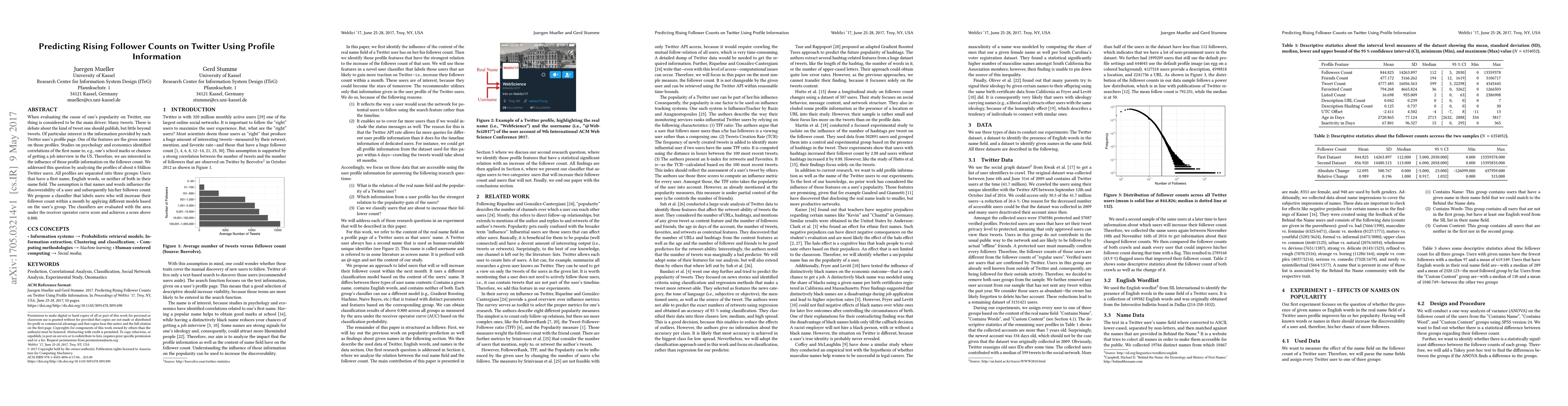 When evaluating the cause of one's popularity on Twitter, one thing is considered to be the main driver: Many tweets. There is debate about the kind of tweet one should publish, but little beyond tweets. Of particular interest is the information provided by each Twitter user's profile page. One of the features are the given names on those profiles. Studies on psychology and economics identified correlations of the first name to, e.g., one's school marks or chances of getting a job interview in the US. Therefore, we are interested in the influence of those profile information on the follower count. We addressed this question by analyzing the profiles of about 6 Million Twitter users. All profiles are separated into three groups: Users that have a first name, English words, or neither of both in their name field. The assumption is that names and words influence the discoverability of a user and subsequently his/her follower count. We propose a classifier that labels users who will increase their follower count within a month by applying different models based on the user's group. The classifiers are evaluated with the area under the receiver operator curve score and achieves a score above 0.800.