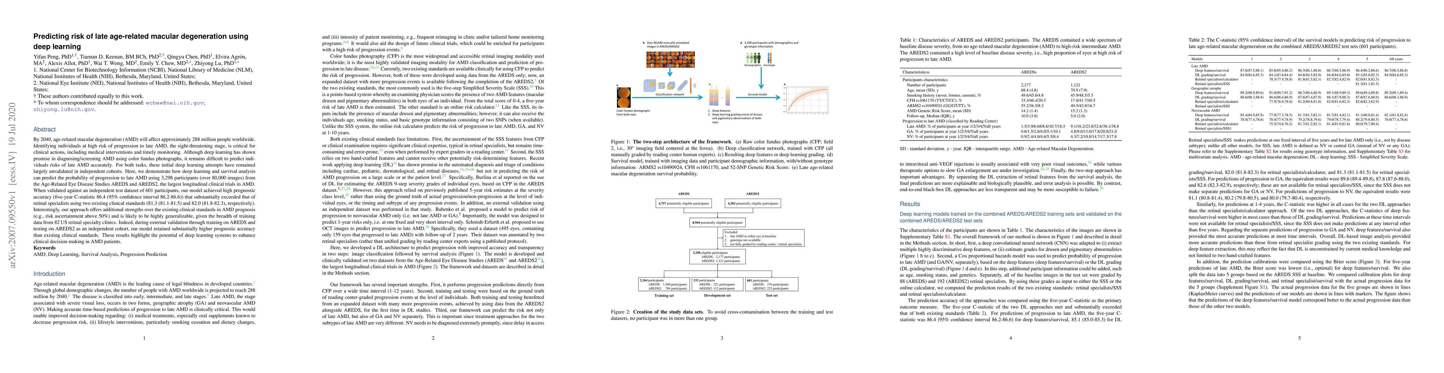 This study demonstrates that deep learning combined with survival analysis can accurately predict the risk of late age-related macular degeneration (AMD) using color fundus photographs, outperforming retinal specialists and existing clinical standards. The model, trained on extensive data from large clinical trials, achieved high prognostic accuracy and is likely generalizable.
