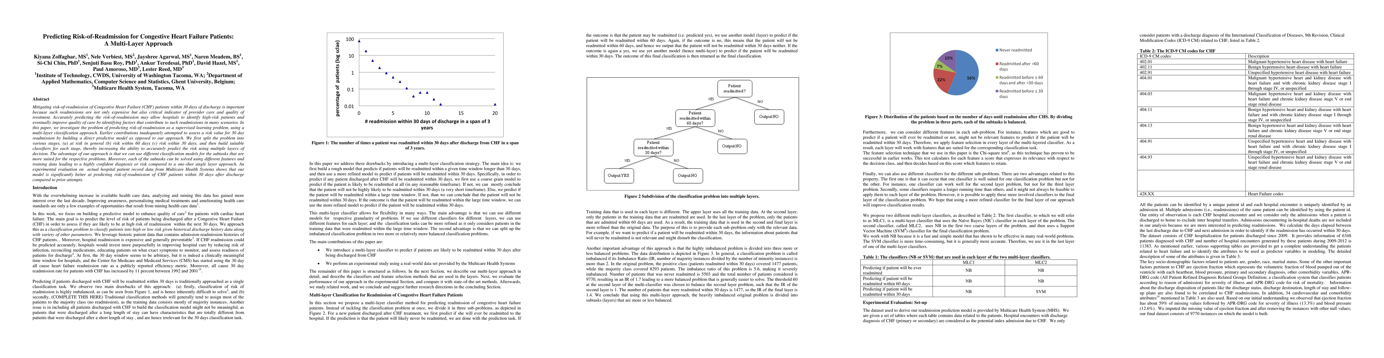This paper proposes a multi-layer classification approach to predict the risk of 30-day readmission for Congestive Heart Failure patients, splitting the problem into stages and using different classifiers for each. The method outperforms prior models by leveraging diverse features and tailored classifiers for each subtask, as demonstrated through evaluation on Multicare Health Systems data.
