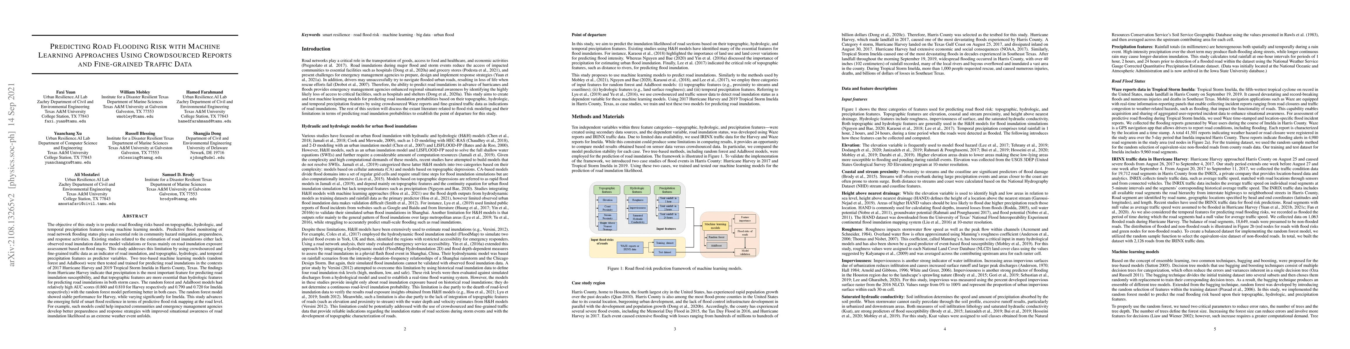 This study uses machine learning models to predict road flooding risks by integrating crowdsourced reports and fine-grained traffic data with topographic, hydrologic, and precipitation features. The random forest model outperformed AdaBoost, showing high predictive accuracy during Hurricane Harvey and Tropical Storm Imelda in Texas.