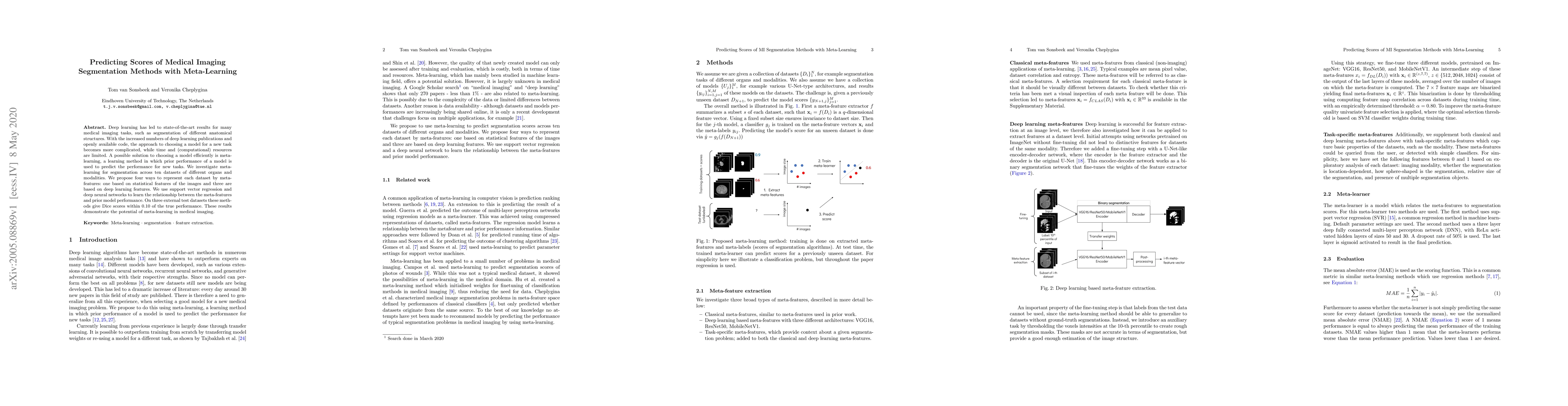 Deep learning has led to state-of-the-art results for many medical imaging tasks, such as segmentation of different anatomical structures. With the increased numbers of deep learning publications and openly available code, the approach to choosing a model for a new task becomes more complicated, while time and (computational) resources are limited. A possible solution to choosing a model efficiently is meta-learning, a learning method in which prior performance of a model is used to predict the performance for new tasks. We investigate meta-learning for segmentation across ten datasets of different organs and modalities. We propose four ways to represent each dataset by meta-features: one based on statistical features of the images and three are based on deep learning features. We use support vector regression and deep neural networks to learn the relationship between the meta-features and prior model performance. On three external test datasets these methods give Dice scores within 0.10 of the true performance. These results demonstrate the potential of meta-learning in medical imaging.