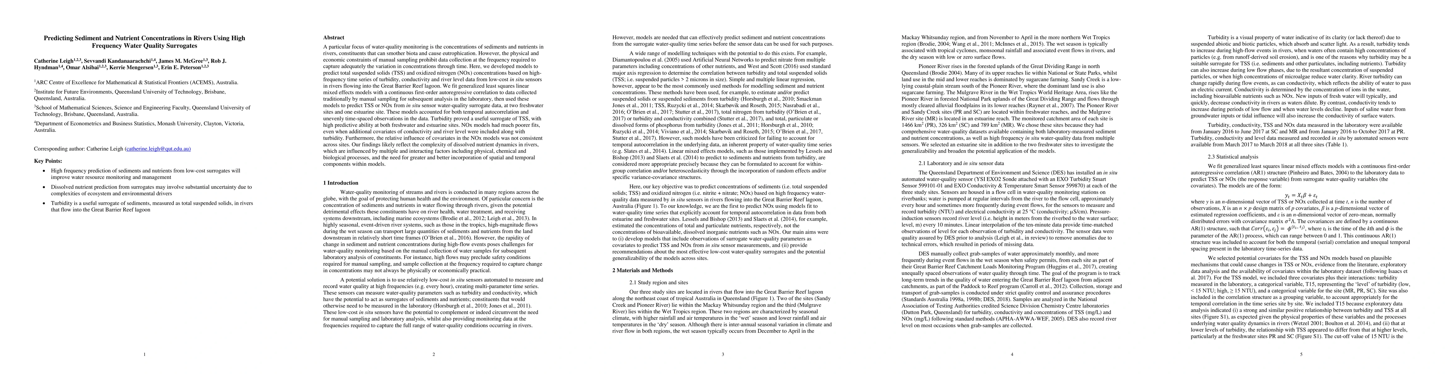 This study developed models to predict sediment and nutrient concentrations in rivers using high-frequency water quality surrogates like turbidity, conductivity, and river level. Turbidity effectively predicted total suspended solids, but models for oxidized nitrogen were less accurate due to the complex dynamics of nutrient interactions.