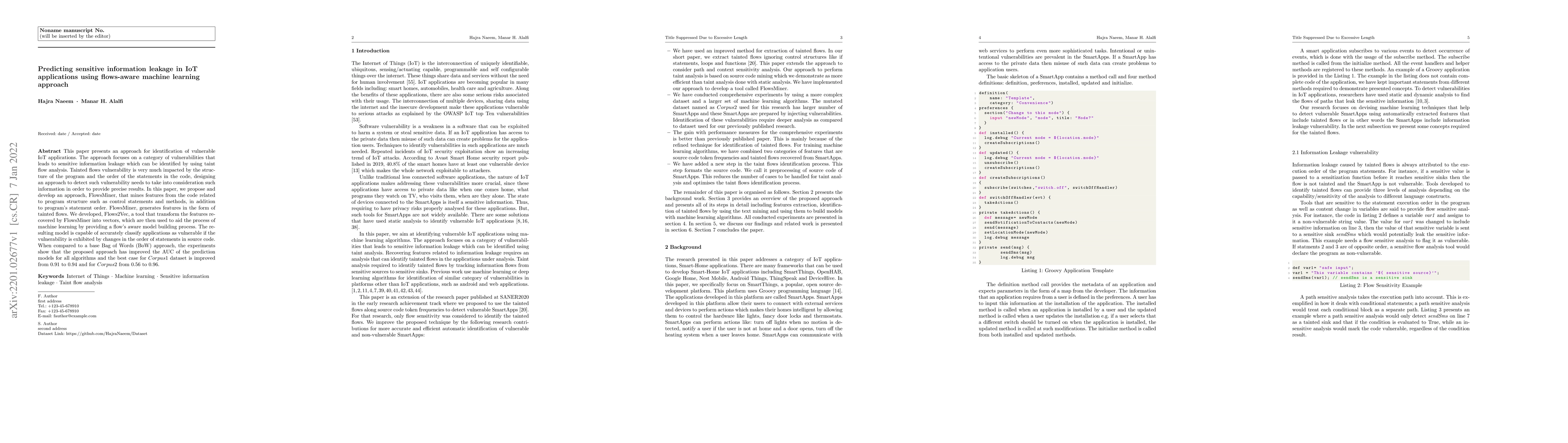 This paper proposes FlowsMiner to identify vulnerabilities in IoT applications that lead to sensitive information leakage through tainted flow analysis. Flows2Vec transforms these features into vectors for machine learning, improving model accuracy and AUC compared to a Bag of Words approach.