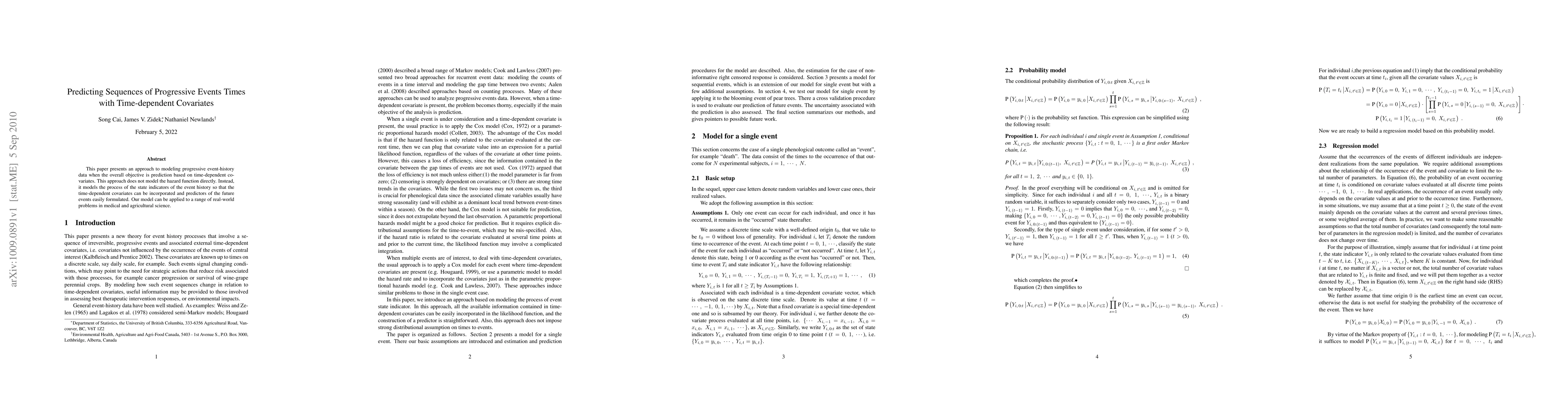 This paper proposes a method for predicting sequences of progressive event times using time-dependent covariates without directly modeling the hazard function, focusing instead on modeling the state indicators of the event history. The approach is applicable to various fields, including medical and agricultural sciences.