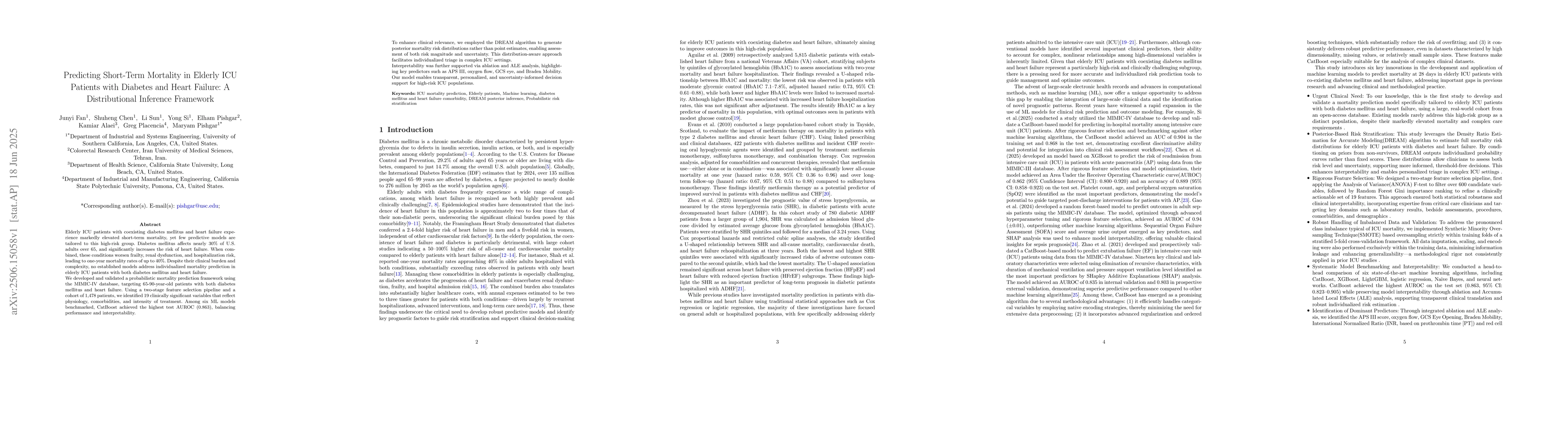 Elderly ICU patients with coexisting diabetes mellitus and heart failure experience markedly elevated short-term mortality, yet few predictive models are tailored to this high-risk group. Diabetes mellitus affects nearly 30% of U.S. adults over 65, and significantly increases the risk of heart failure. When combined, these conditions worsen frailty, renal dysfunction, and hospitalization risk, leading to one-year mortality rates of up to 40%. Despite their clinical burden and complexity, no established models address individualized mortality prediction in elderly ICU patients with both diabetes mellitus and heart failure. We developed and validated a probabilistic mortality prediction framework using the MIMIC-IV database, targeting 65-90-year-old patients with both diabetes mellitus and heart failure. Using a two-stage feature selection pipeline and a cohort of 1,478 patients, we identified 19 clinically significant variables that reflect physiology, comorbidities, and intensity of treatment. Among six ML models benchmarked, CatBoost achieved the highest test AUROC (0.863), balancing performance and interpretability. To enhance clinical relevance, we employed the DREAM algorithm to generate posterior mortality risk distributions rather than point estimates, enabling assessment of both risk magnitude and uncertainty. This distribution-aware approach facilitates individualized triage in complex ICU settings. Interpretability was further supported via ablation and ALE analysis, highlighting key predictors such as APS III, oxygen flow, GCS eye, and Braden Mobility. Our model enables transparent, personalized, and uncertainty-informed decision support for high-risk ICU populations.