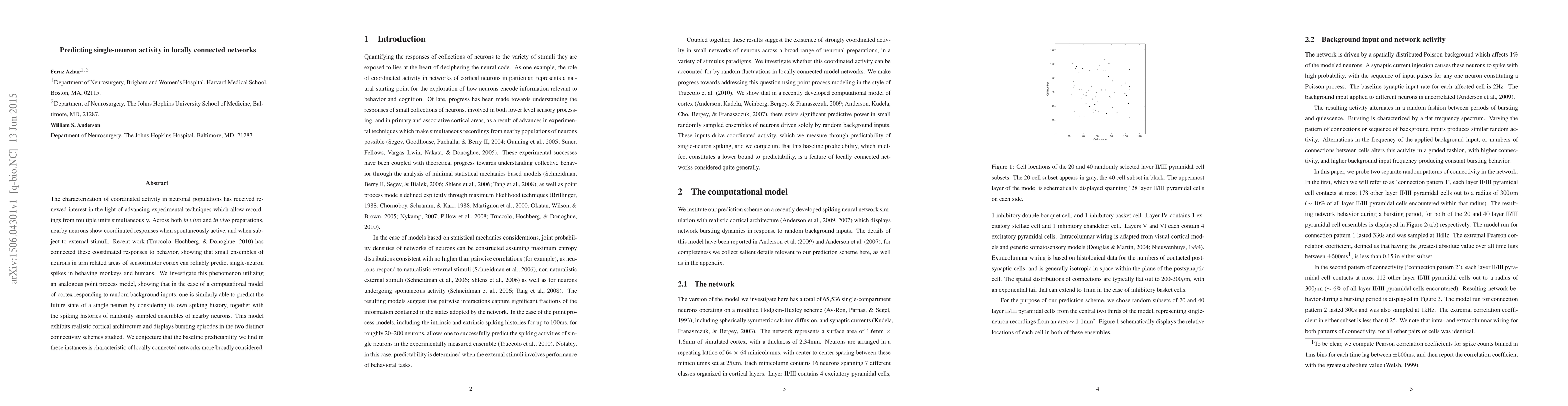 The characterization of coordinated activity in neuronal populations has received renewed interest in the light of advancing experimental techniques which allow recordings from multiple units simultaneously. Across both in vitro and in vivo preparations, nearby neurons show coordinated responses when spontaneously active, and when subject to external stimuli. Recent work (Truccolo, Hochberg, & Donoghue, 2010) has connected these coordinated responses to behavior, showing that small ensembles of neurons in arm related areas of sensorimotor cortex can reliably predict single-neuron spikes in behaving monkeys and humans. We investigate this phenomenon utilizing an analogous point process model, showing that in the case of a computational model of cortex responding to random background inputs, one is similarly able to predict the future state of a single neuron by considering its own spiking history, together with the spiking histories of randomly sampled ensembles of nearby neurons. This model exhibits realistic cortical architecture and displays bursting episodes in the two distinct connectivity schemes studied. We conjecture that the baseline predictability we find in these instances is characteristic of locally connected networks more broadly considered.