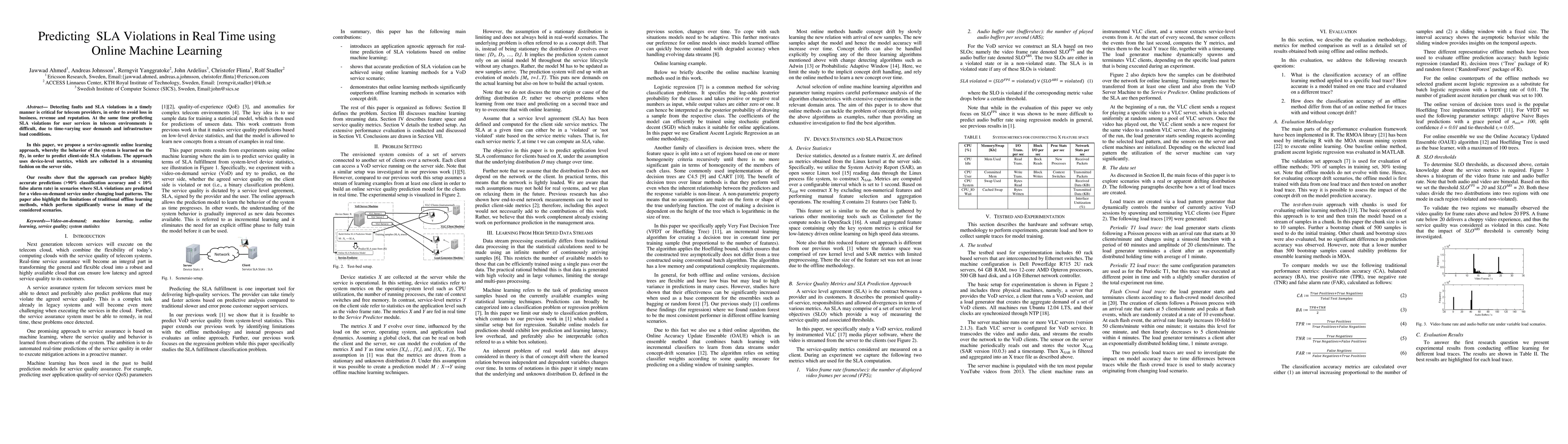 This paper proposes a real-time online machine learning approach to predict SLA violations in telecom environments with high accuracy (>90% classification rate). It outperforms traditional offline learning methods in various scenarios.