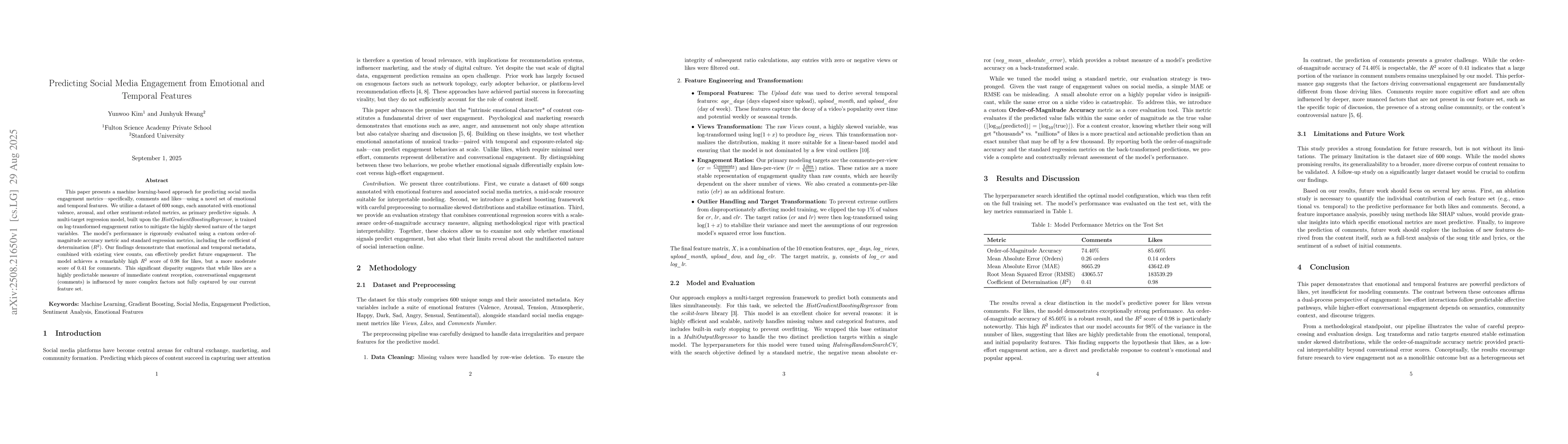 We present a machine learning approach for predicting social media engagement (comments and likes) from emotional and temporal features. The dataset contains 600 songs with annotations for valence, arousal, and related sentiment metrics. A multi target regression model based on HistGradientBoostingRegressor is trained on log transformed engagement ratios to address skewed targets. Performance is evaluated with both a custom order of magnitude accuracy and standard regression metrics, including the coefficient of determination (R^2). Results show that emotional and temporal metadata, together with existing view counts, predict future engagement effectively. The model attains R^2 = 0.98 for likes but only R^2 = 0.41 for comments. This gap indicates that likes are largely driven by readily captured affective and exposure signals, whereas comments depend on additional factors not represented in the current feature set.