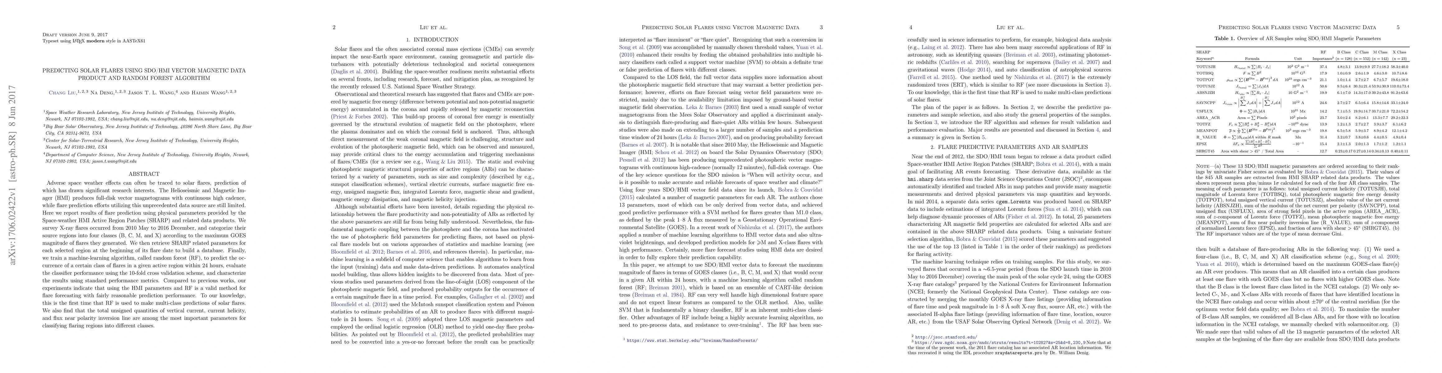 This study predicts solar flares using the SDO/HMI vector magnetic data and a random forest algorithm, finding that HMI parameters and RF provide a valid method for forecasting flare classes (B, C, M, X) with reasonable accuracy. The most important predictors identified include the total unsigned quantities of vertical current, current helicity, and flux near the polarity inversion line.