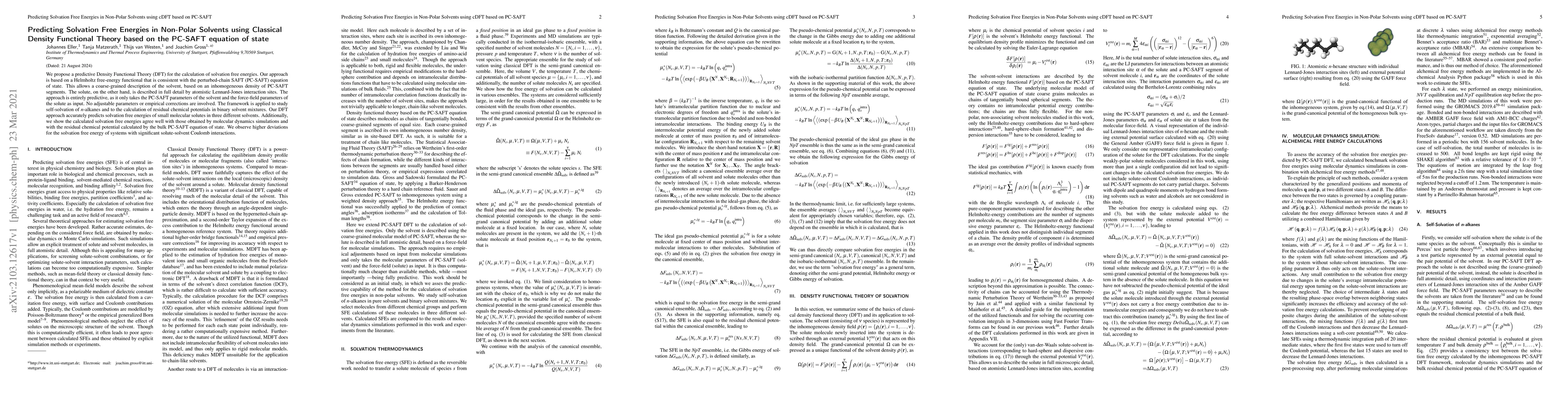This paper proposes a predictive Density Functional Theory (DFT) model for calculating solvation free energies in non-polar solvents, based on the PC-SAFT equation of state, which provides a coarse-grained solvent description while using atomistic details for solutes. The method accurately predicts solvation free energies and agrees well with molecular dynamics simulations and bulk PC-SAFT calculations.