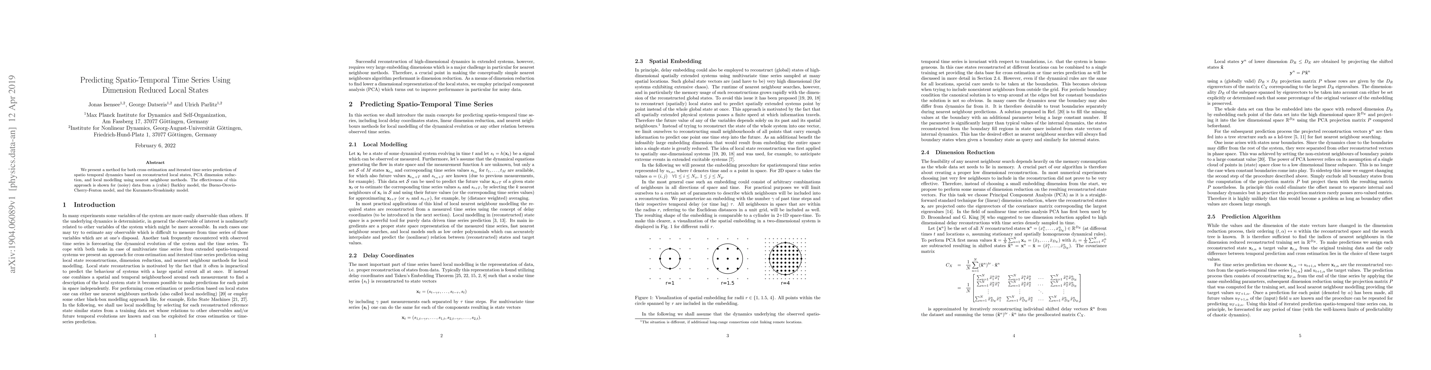 This paper proposes a method for predicting spatio-temporal time series using reconstructed local states, PCA dimension reduction, and local modeling via nearest neighbor techniques. The effectiveness of the method is demonstrated through its application to noisy data from the Barkley, Bueno-Orovio-Cherry-Fenton, and Kuramoto-Sivashinsky models.