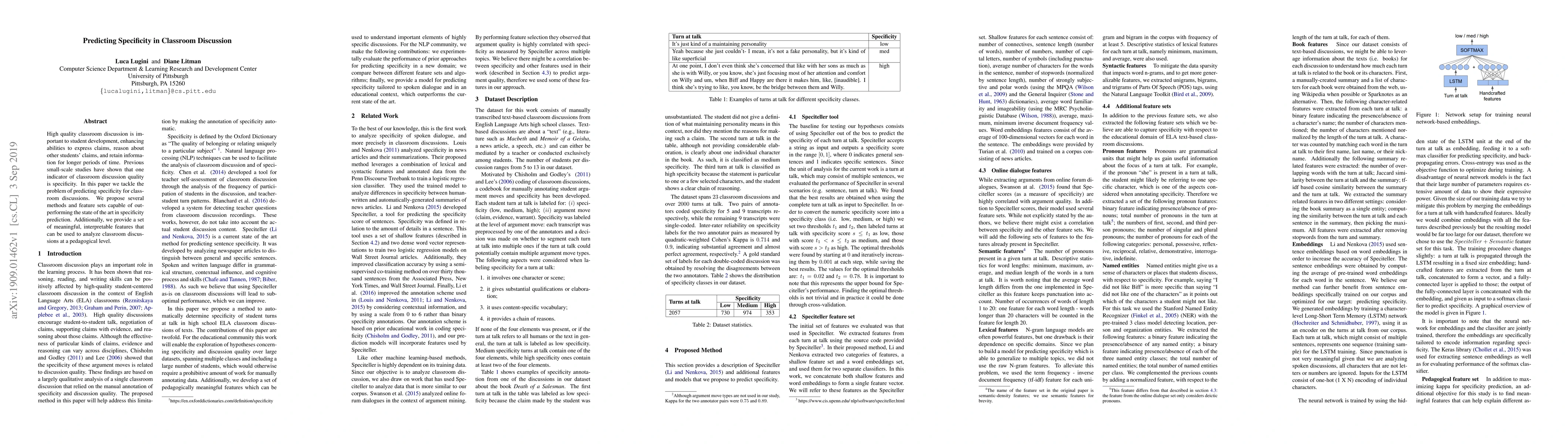 This paper proposes methods to predict specificity in classroom discussions, which is linked to higher quality discourse. The authors introduce new feature sets that outperform existing models, aiming to provide insights for pedagogical analysis.