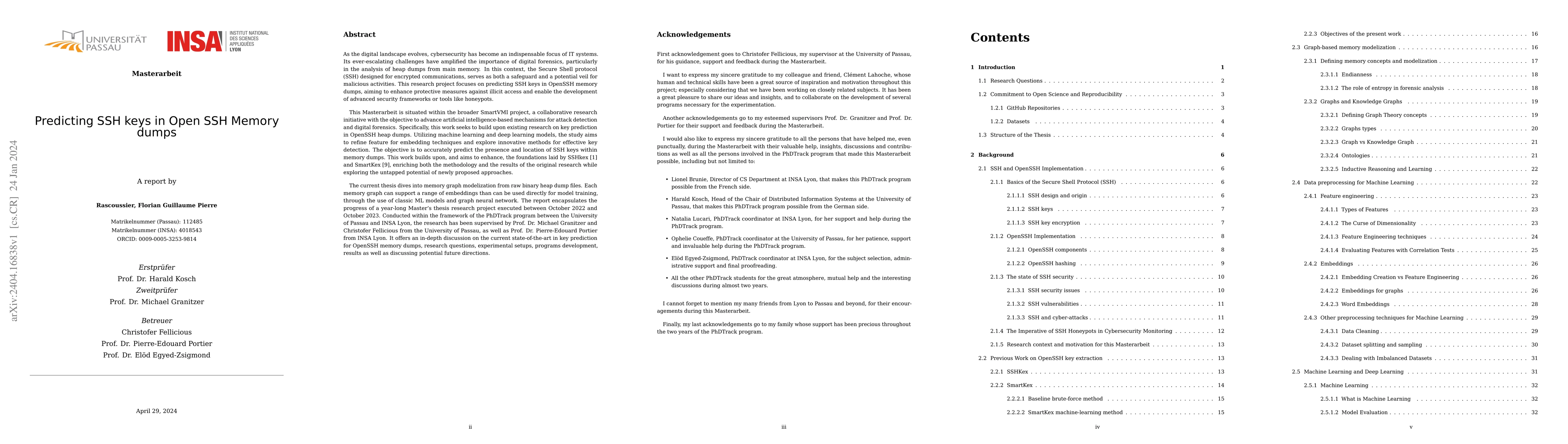 As the digital landscape evolves, cybersecurity has become an indispensable focus of IT systems. Its ever-escalating challenges have amplified the importance of digital forensics, particularly in the analysis of heap dumps from main memory. In this context, the Secure Shell protocol (SSH) designed for encrypted communications, serves as both a safeguard and a potential veil for malicious activities. This research project focuses on predicting SSH keys in OpenSSH memory dumps, aiming to enhance protective measures against illicit access and enable the development of advanced security frameworks or tools like honeypots. This Masterarbeit is situated within the broader SmartVMI project, and seeks to build upon existing research on key prediction in OpenSSH heap dumps. Utilizing machine learning (ML) and deep learning models, the study aims to refine features for embedding techniques and explore innovative methods for effective key detection based on recent advancements in Knowledge Graph and ML. The objective is to accurately predict the presence and location of SSH keys within memory dumps. This work builds upon, and aims to enhance, the foundations laid by SSHkex and SmartKex, enriching both the methodology and the results of the original research while exploring the untapped potential of newly proposed approaches. The current thesis dives into memory graph modelization from raw binary heap dump files. Each memory graph can support a range of embeddings that can be used directly for model training, through the use of classic ML models and graph neural network. It offers an in-depth discussion on the current state-of-the-art in key prediction for OpenSSH memory dumps, research questions, experimental setups, programs development, results as well as discussing potential future directions.