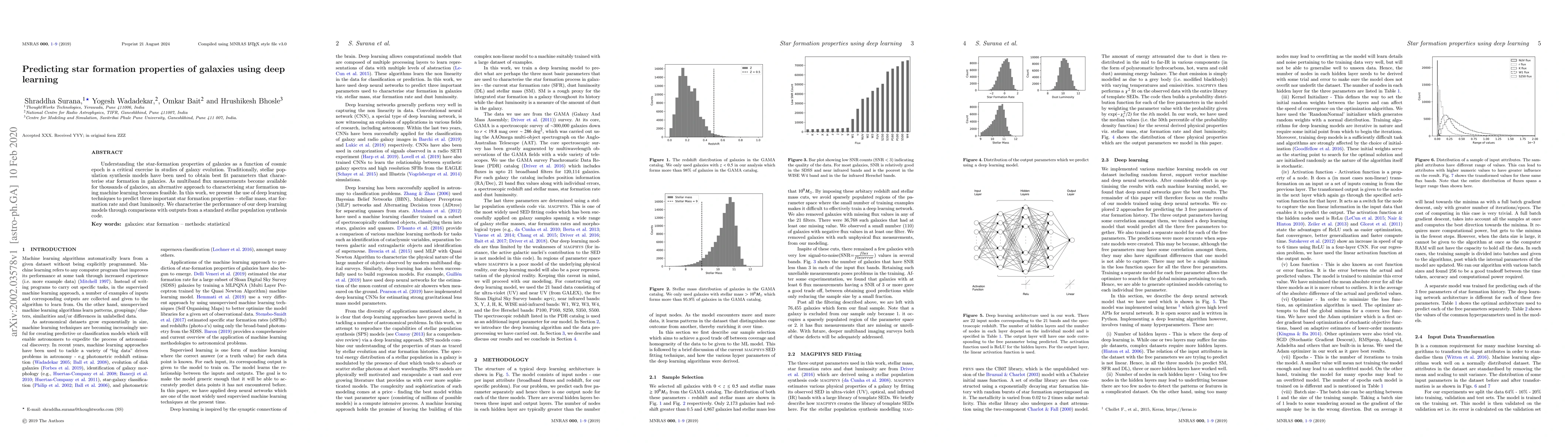 Understanding the star-formation properties of galaxies as a function of cosmic epoch is a critical exercise in studies of galaxy evolution. Traditionally, stellar population synthesis models have been used to obtain best fit parameters that characterise star formation in galaxies. As multiband flux measurements become available for thousands of galaxies, an alternative approach to characterising star formation using machine learning becomes feasible. In this work, we present the use of deep learning techniques to predict three important star formation properties -- stellar mass, star formation rate and dust luminosity. We characterise the performance of our deep learning models through comparisons with outputs from a standard stellar population synthesis code.
