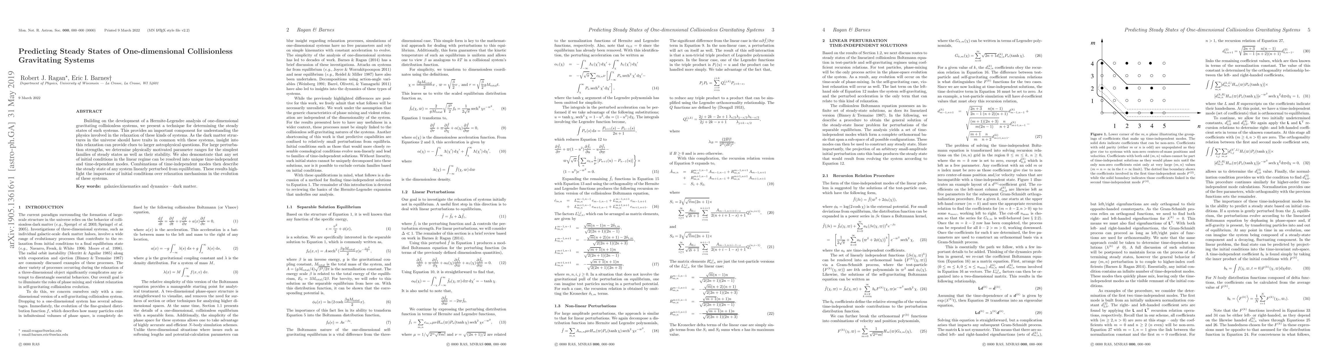 This paper develops a Hermite-Legendre analysis technique to predict steady states of one-dimensional collisionless gravitating systems, crucial for understanding the relaxation processes in dark matter structures. It identifies parameter ranges for stable steady states and shows that initial conditions determine the evolution more than relaxation mechanisms.