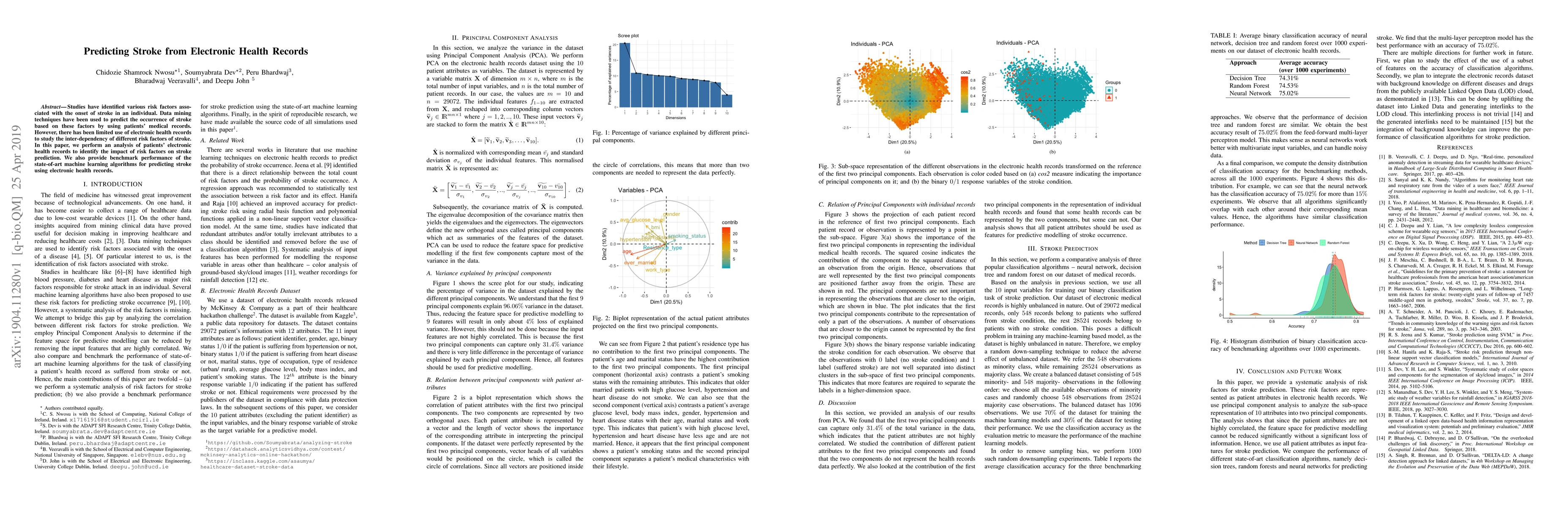 This paper analyzes electronic health records to identify the inter-dependency of stroke risk factors and benchmarks state-of-the-art machine learning algorithms for predicting stroke based on these records.