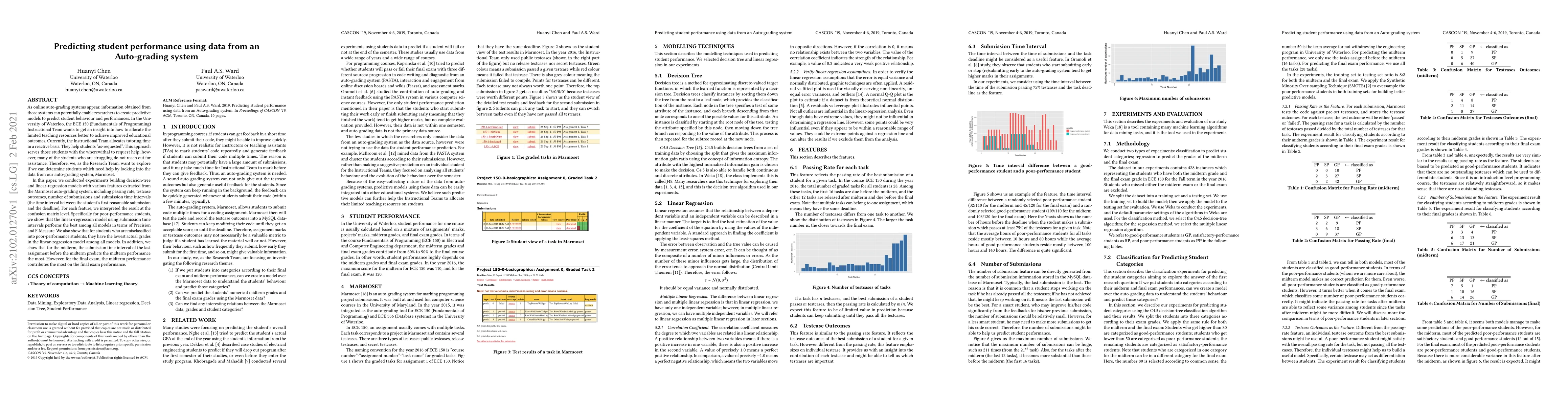 This paper explores the use of data from an auto-grading system to predict student performance in an online course. The study builds decision-tree and linear-regression models using features like passing rate and submission intervals, finding that the linear-regression model with submission time intervals best predicts poor-performance students.