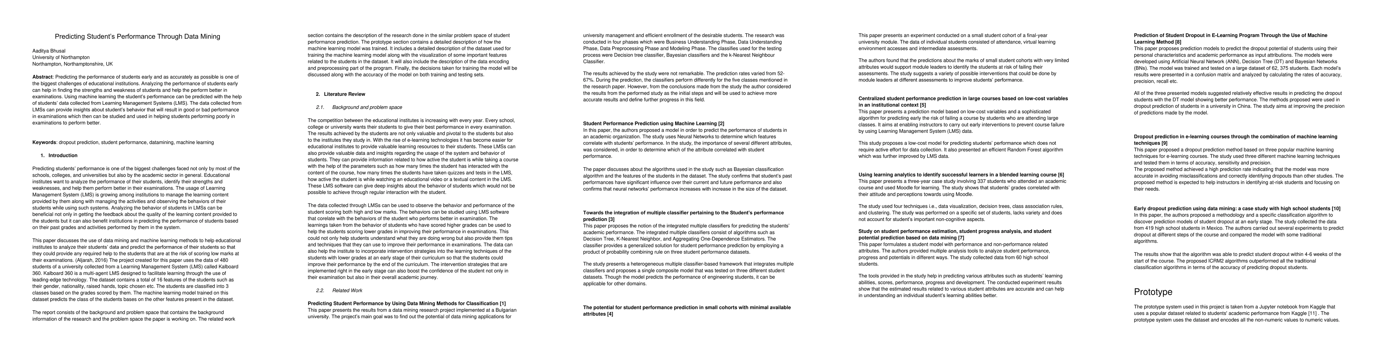 Predicting the performance of students early and as accurately as possible is one of the biggest challenges of educational institutions. Analyzing the performance of students early can help in finding the strengths and weakness of students and help the perform better in examinations. Using machine learning the student's performance can be predicted with the help of students' data collected from Learning Management Systems (LMS). The data collected from LMSs can provide insights about student's behavior that will result in good or bad performance in examinations which then can be studied and used in helping students performing poorly in examinations to perform better.