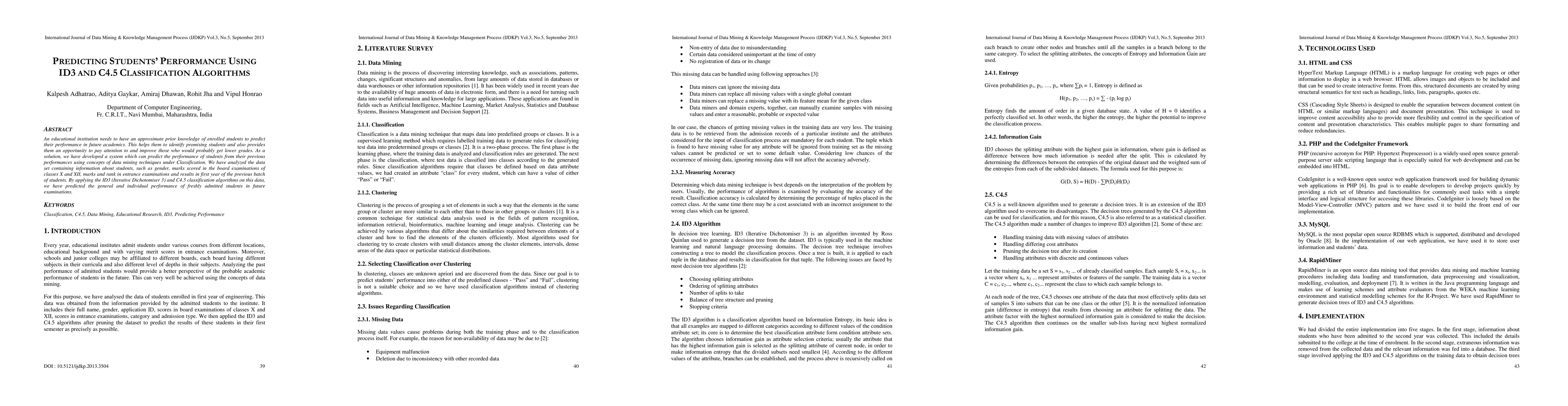 A study predicts student performance using ID3 and C4.5 classification algorithms based on previous exam marks and entrance scores, helping institutions identify promising students and improve those at risk.