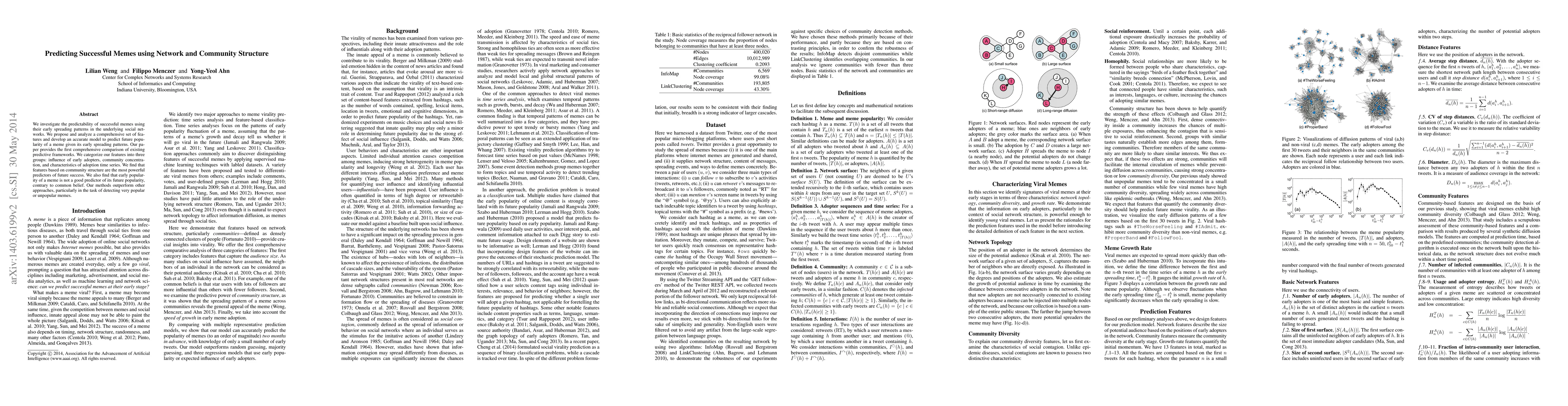 This paper develops a model to predict meme success based on early spreading patterns in social networks, finding that community structure features are the most predictive. Contrary to common belief, early popularity does not reliably forecast future success, and the proposed methods outperform existing frameworks.