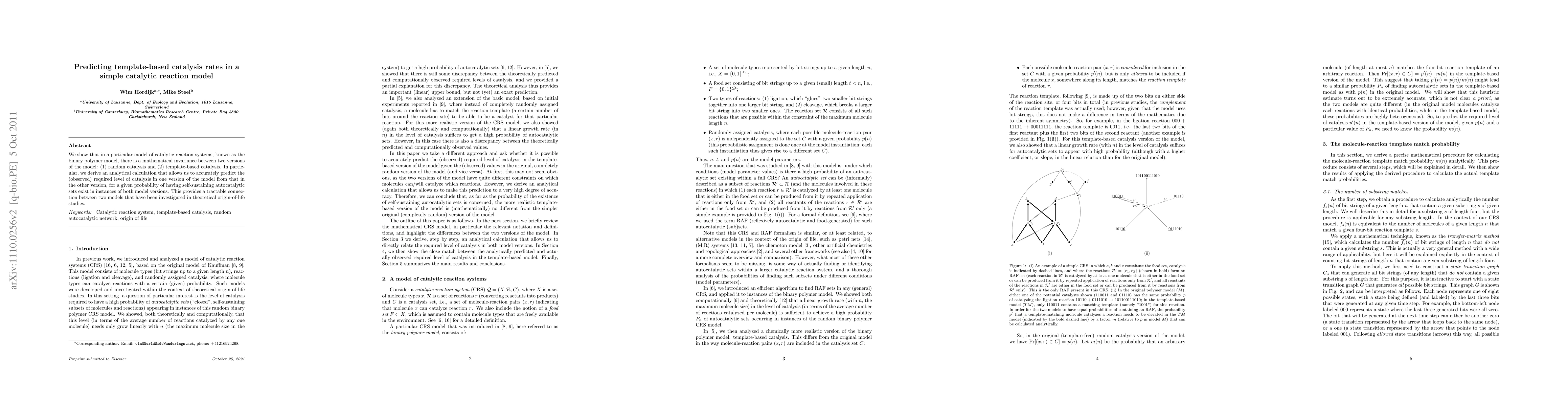 We show that in a particular model of catalytic reaction systems, known as the binary polymer model, there is a mathematical invariance between two versions of the model: (1) random catalysis and (2) template-based catalysis. In particular, we derive an analytical calculation that allows us to accurately predict the (observed) required level of catalysis in one version of the model from that in the other version, for a given probability of having self-sustaining autocatalytic sets exist in instances of both model versions. This provides a tractable connection between two models that have been investigated in theoretical origin-of-life studies.