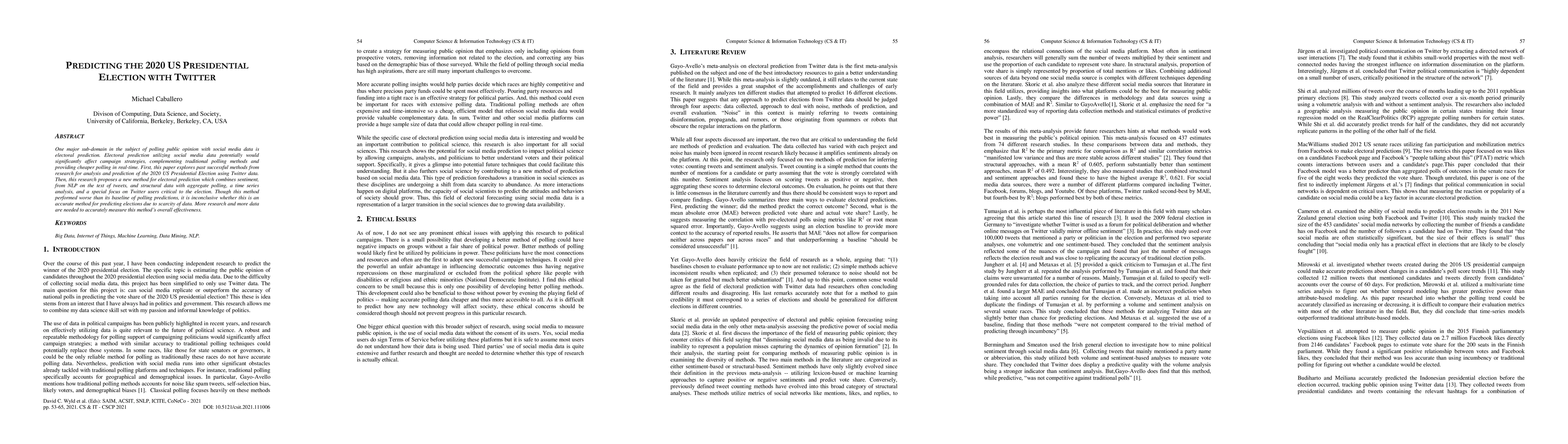 This paper investigates past methods for predicting the 2020 US Presidential Election using Twitter data, proposing a new method combining sentiment analysis, structural data, and aggregate polling. Despite its performance being worse than traditional polling, the study concludes that more data and research are needed to accurately assess its effectiveness.