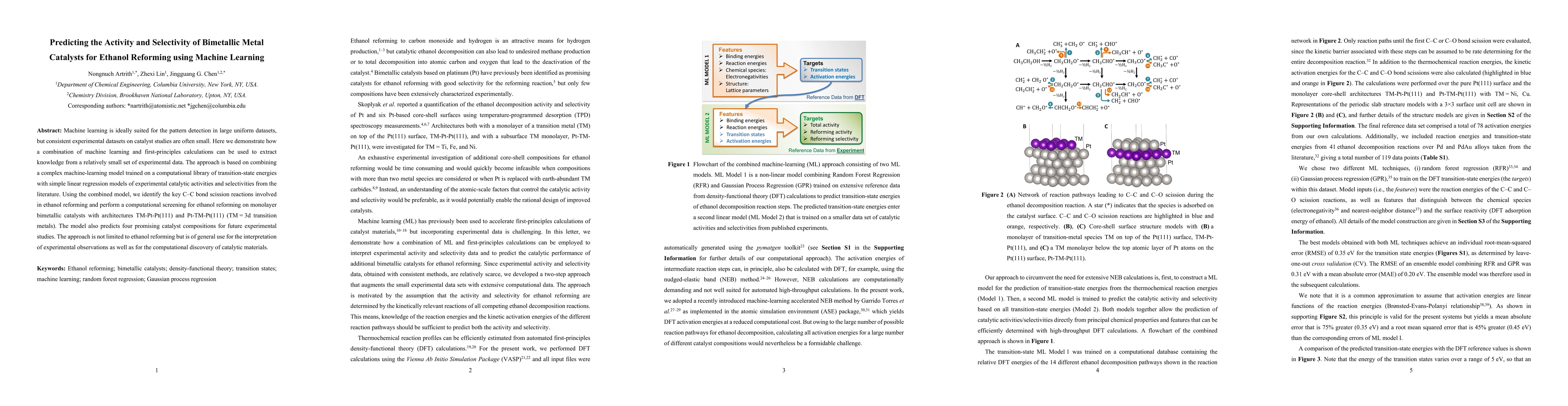 This paper combines machine learning and first-principles calculations to predict the activity and selectivity of bimetallic catalysts for ethanol reforming from small experimental datasets. The model identifies key reactions and predicts four promising bimetallic catalyst compositions for future study.