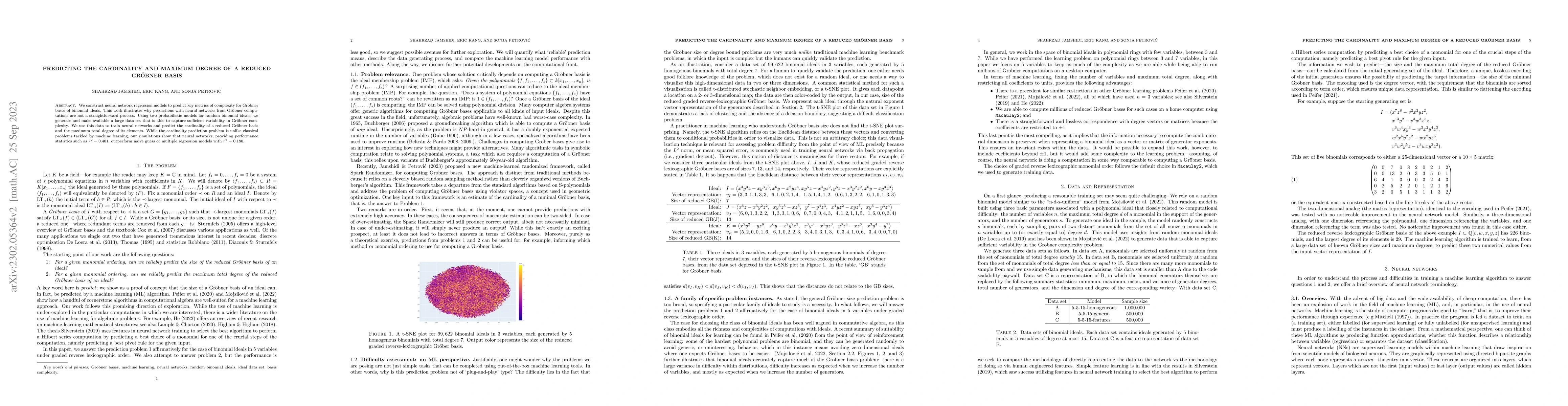 This paper develops neural network regression models to predict the cardinality and maximum degree of reduced Gröbner bases for binomial ideals. Despite the complexity, the neural networks achieve better performance ($r^2 = 0.401$) compared to naive or multiple regression models ($r^2 = 0.180$).