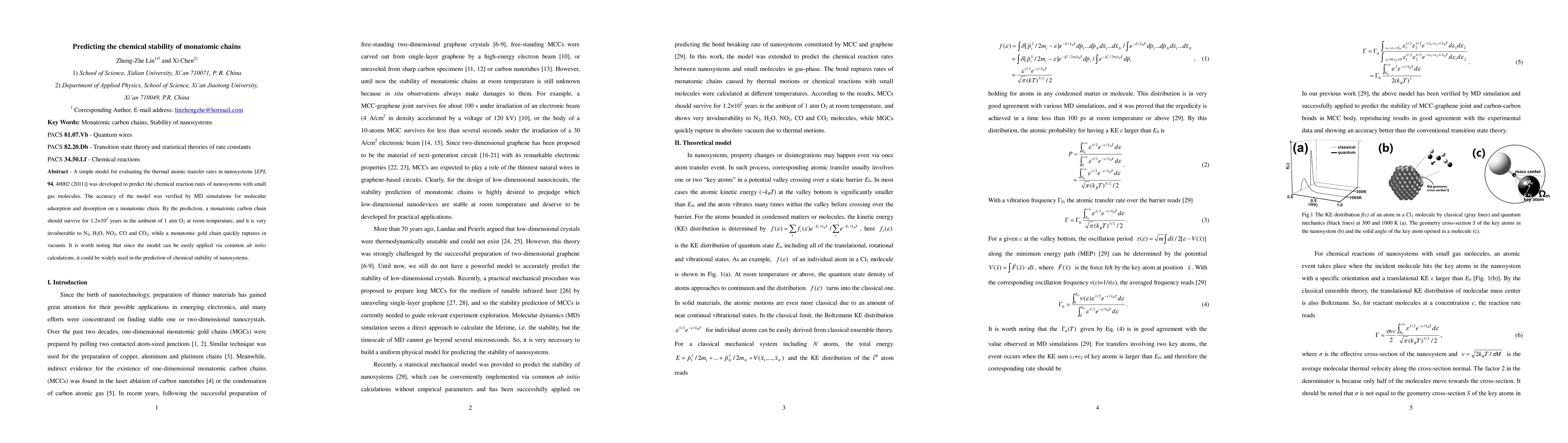 This research introduces a simple model for predicting thermal atomic transfer rates in nanosystems, validated through MD simulations. The model predicts that a monatomic carbon chain remains stable for 120 years in 1 atm O2 at room temperature, whereas a monatomic gold chain quickly ruptures in vacuum, highlighting the chemical stability of carbon chains against various gases.