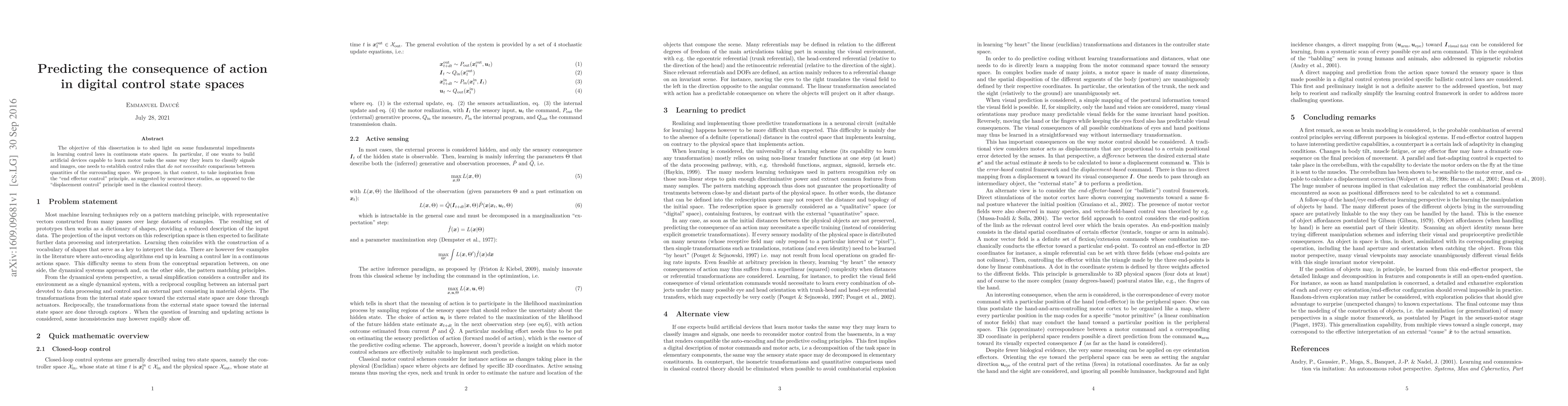 The objective of this dissertation is to shed light on some fundamental impediments in learning control laws in continuous state spaces. In particular, if one wants to build artificial devices capable to learn motor tasks the same way they learn to classify signals and images, one needs to establish control rules that do not necessitate comparisons between quantities of the surrounding space. We propose, in that context, to take inspiration from the "end effector control" principle, as suggested by neuroscience studies, as opposed to the "displacement control" principle used in the classical control theory.