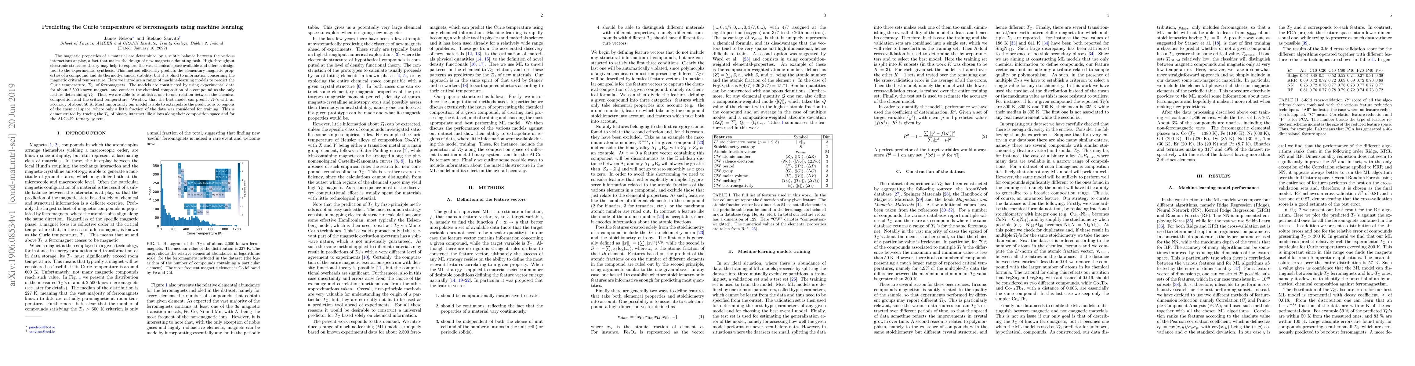 This paper introduces machine-learning models to predict the Curie temperature of ferromagnets using chemical composition data, achieving an accuracy of about 50K. The models can also extrapolate predictions to unexplored chemical compositions, demonstrating their effectiveness in binary intermetallic alloys and the Al-Co-Fe ternary system.