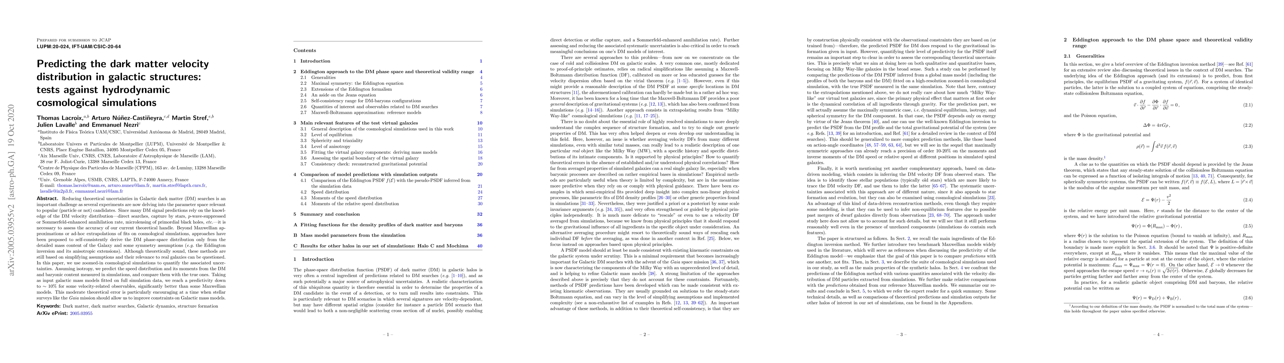 Reducing theoretical uncertainties in Galactic dark matter (DM) searches is an important challenge as several experiments are now delving into the parameter space relevant to popular (particle or not) candidates. Since many DM signal predictions rely on the knowledge of the DM velocity distribution---direct searches, capture by stars, p-wave-suppressed or Sommerfeld-enhanced annihilation rate, microlensing of primordial black holes, etc.---it is necessary to assess the accuracy of our current theoretical handle. Beyond Maxwellian approximations or ad-hoc extrapolations of fits on cosmological simulations, approaches have been proposed to self-consistently derive the DM phase-space distribution only from the detailed mass content of the Galaxy and some symmetry assumptions (e.g. the Eddington inversion and its anisotropic extensions). Although theoretically sound, these methods are still based on simplifying assumptions and their relevance to real galaxies can be questioned. In this paper, we use zoomed-in cosmological simulations to quantify the associated uncertainties. Assuming isotropy, we predict the speed distribution and its moments from the DM and baryonic content measured in simulations, and compare them with the true ones. Taking as input galactic mass models fitted on full simulation data, we reach a predictivity down to ~ 10% for some velocity-related observables, significantly better than some Maxwellian models. This moderate theoretical error is particularly encouraging at a time when stellar surveys like the Gaia mission should allow us to improve constraints on Galactic mass models.