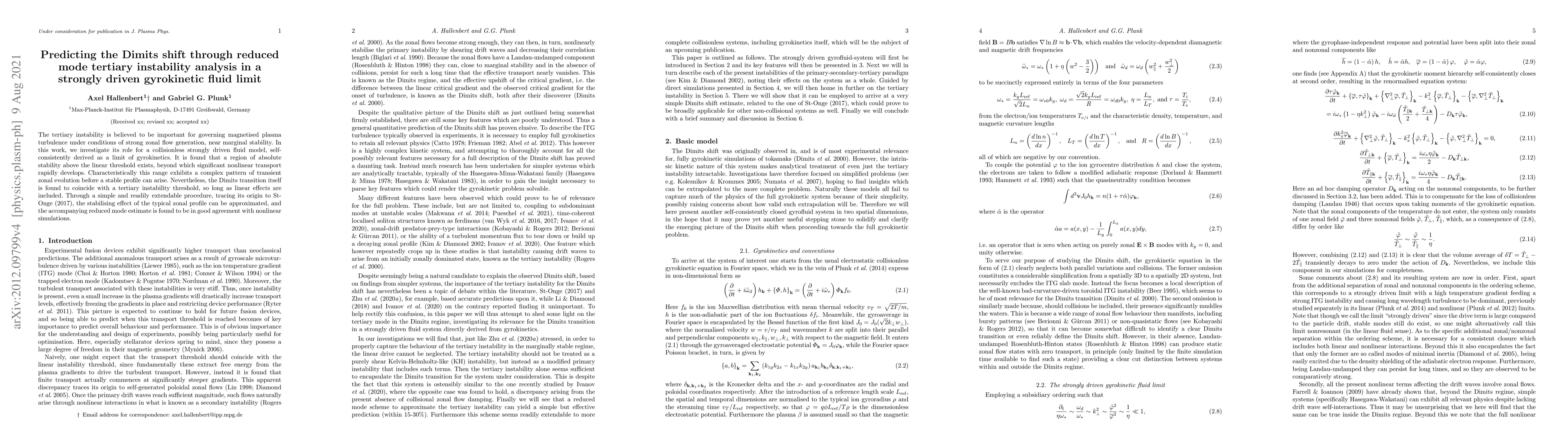 This paper explores the tertiary instability's role in predicting the Dimits shift in strongly driven gyrokinetic plasmas, finding that the transition coincides with tertiary instability thresholds, and a simplified model accurately estimates the stabilizing effect of zonal profiles. The study reveals a region of absolute stability above the linear threshold, leading to rapid nonlinear transport development.