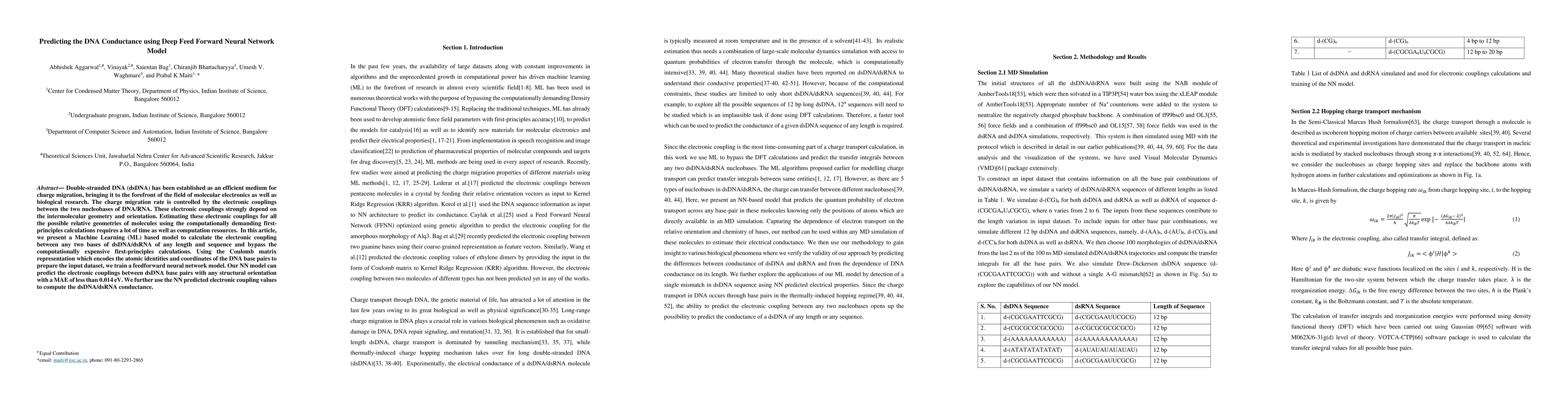 Double-stranded DNA (dsDNA) has been established as an efficient medium for charge migration, bringing it to the forefront of the field of molecular electronics as well as biological research. The charge migration rate is controlled by the electronic couplings between the two nucleobases of DNA/RNA. These electronic couplings strongly depend on the intermolecular geometry and orientation. Estimating these electronic couplings for all the possible relative geometries of molecules using the computationally demanding first-principles calculations requires a lot of time as well as computation resources. In this article, we present a Machine Learning (ML) based model to calculate the electronic coupling between any two bases of dsDNA/dsRNA of any length and sequence and bypass the computationally expensive first-principles calculations. Using the Coulomb matrix representation which encodes the atomic identities and coordinates of the DNA base pairs to prepare the input dataset, we train a feedforward neural network model. Our NN model can predict the electronic couplings between dsDNA base pairs with any structural orientation with a MAE of less than 0.014 eV. We further use the NN predicted electronic coupling values to compute the dsDNA/dsRNA conductance.