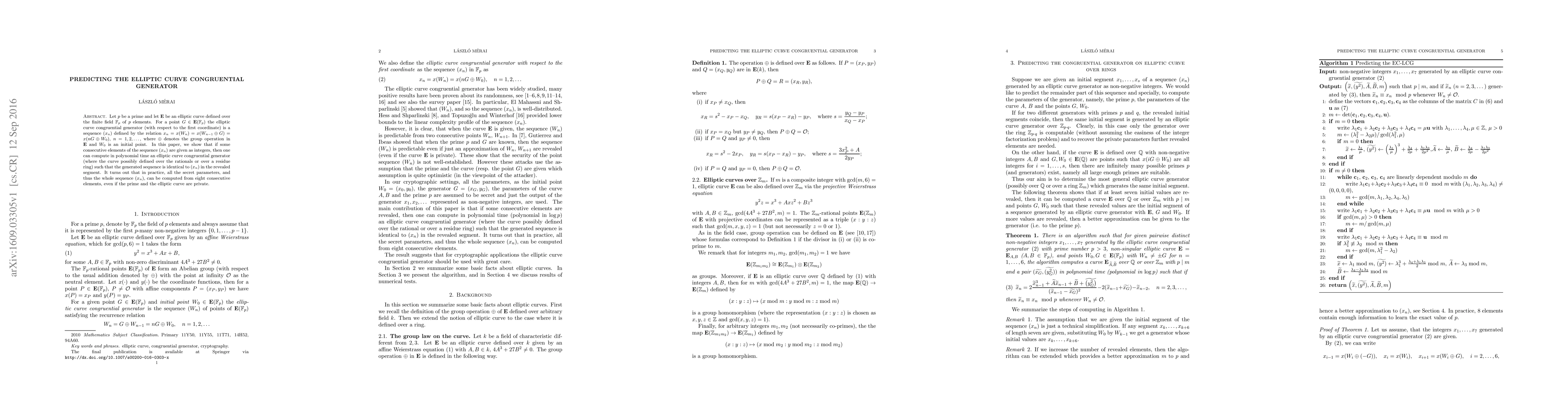 Let $p$ be a prime and let $\mathbf{E}$ be an elliptic curve defined over the finite field $\mathbb{F}_p$ of $p$ elements. For a point $G\in\mathbf{E}(\mathbb{F}_p)$ the elliptic curve congruential generator (with respect to the first coordinate) is a sequence $(x_n)$ defined by the relation $x_n=x(W_n)=x(W_{n-1}\oplus G)=x(nG\oplus W_0)$, $n=1,2,\dots$, where $\oplus$ denotes the group operation in $\mathbf{E}$ and $W_0$ is an initial point. In this paper, we show that if some consecutive elements of the sequence $(x_n)$ are given as integers, then one can compute in polynomial time an elliptic curve congruential generator (where the curve possibly defined over the rationals or over a residue ring) such that the generated sequence is identical to $(x_n)$ in the revealed segment. It turns out that in practice, all the secret parameters, and thus the whole sequence $(x_n)$, can be computed from eight consecutive elements, even if the prime and the elliptic curve are private.