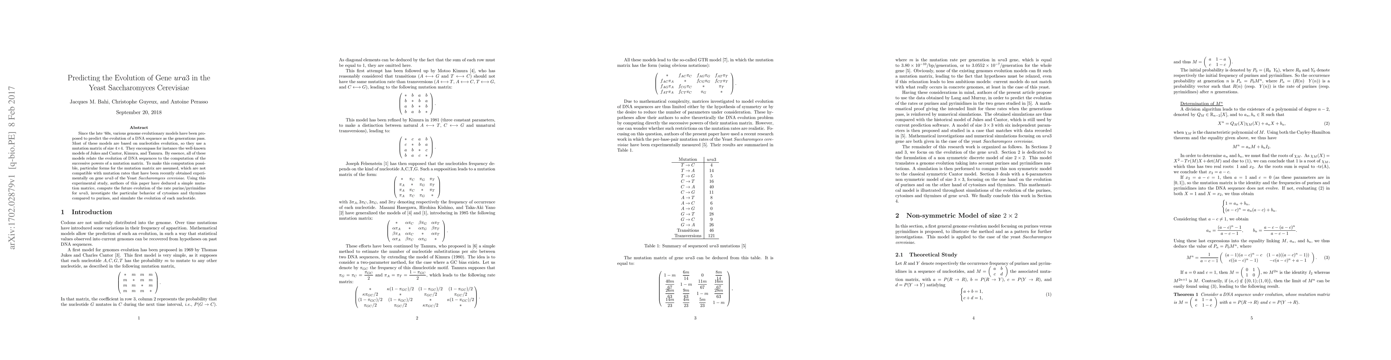 Since the late `60s, various genome evolutionary models have been proposed to predict the evolution of a DNA sequence as the generations pass. Most of these models are based on nucleotides evolution, so they use a mutation matrix of size 4x4. They encompass for instance the well-known models of Jukes and Cantor, Kimura, and Tamura. By essence, all of these models relate the evolution of DNA sequences to the computation of the successive powers of a mutation matrix. To make this computation possible, particular forms for the mutation matrix are assumed, which are not compatible with mutation rates that have been recently obtained experimentally on gene ura3 of the Yeast Saccharomyces cerevisiae. Using this experimental study, authors of this paper have deduced a simple mutation matrice, compute the future evolution of the rate purine/pyrimidine for ura3, investigate the particular behavior of cytosines and thymines compared to purines, and simulate the evolution of each nucleotide.
