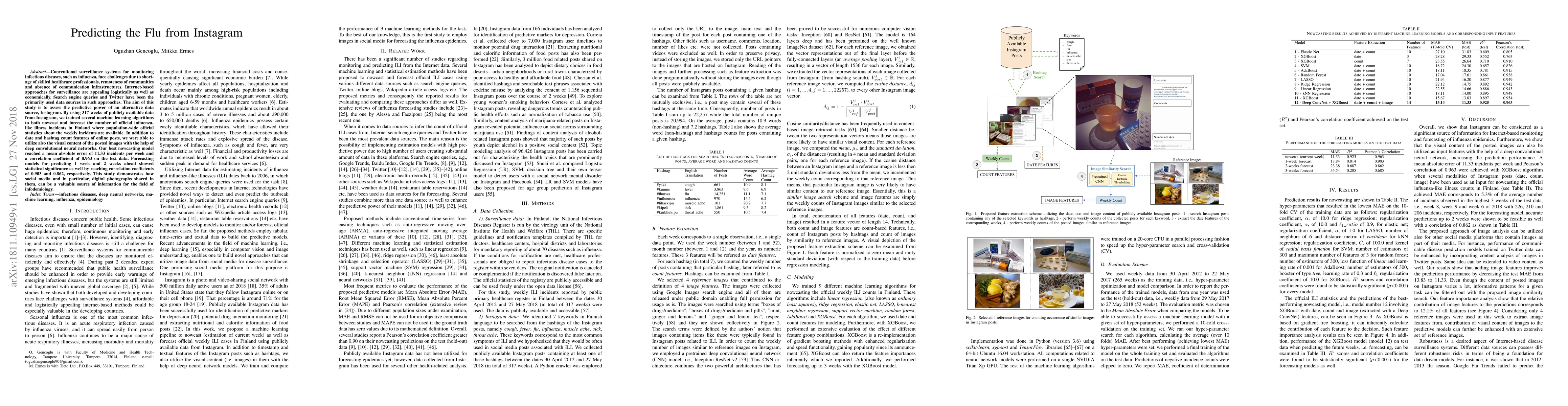 Conventional surveillance systems for monitoring infectious diseases, such as influenza, face challenges due to shortage of skilled healthcare professionals, remoteness of communities and absence of communication infrastructures. Internet-based approaches for surveillance are appealing logistically as well as economically. Search engine queries and Twitter have been the primarily used data sources in such approaches. The aim of this study is to assess the predictive power of an alternative data source, Instagram. By using 317 weeks of publicly available data from Instagram, we trained several machine learning algorithms to both nowcast and forecast the number of official influenza-like illness incidents in Finland where population-wide official statistics about the weekly incidents are available. In addition to date and hashtag count features of online posts, we were able to utilize also the visual content of the posted images with the help of deep convolutional neural networks. Our best nowcasting model reached a mean absolute error of 11.33 incidents per week and a correlation coefficient of 0.963 on the test data. Forecasting models for predicting 1 week and 2 weeks ahead showed statistical significance as well by reaching correlation coefficients of 0.903 and 0.862, respectively. This study demonstrates how social media and in particular, digital photographs shared in them, can be a valuable source of information for the field of infodemiology.
